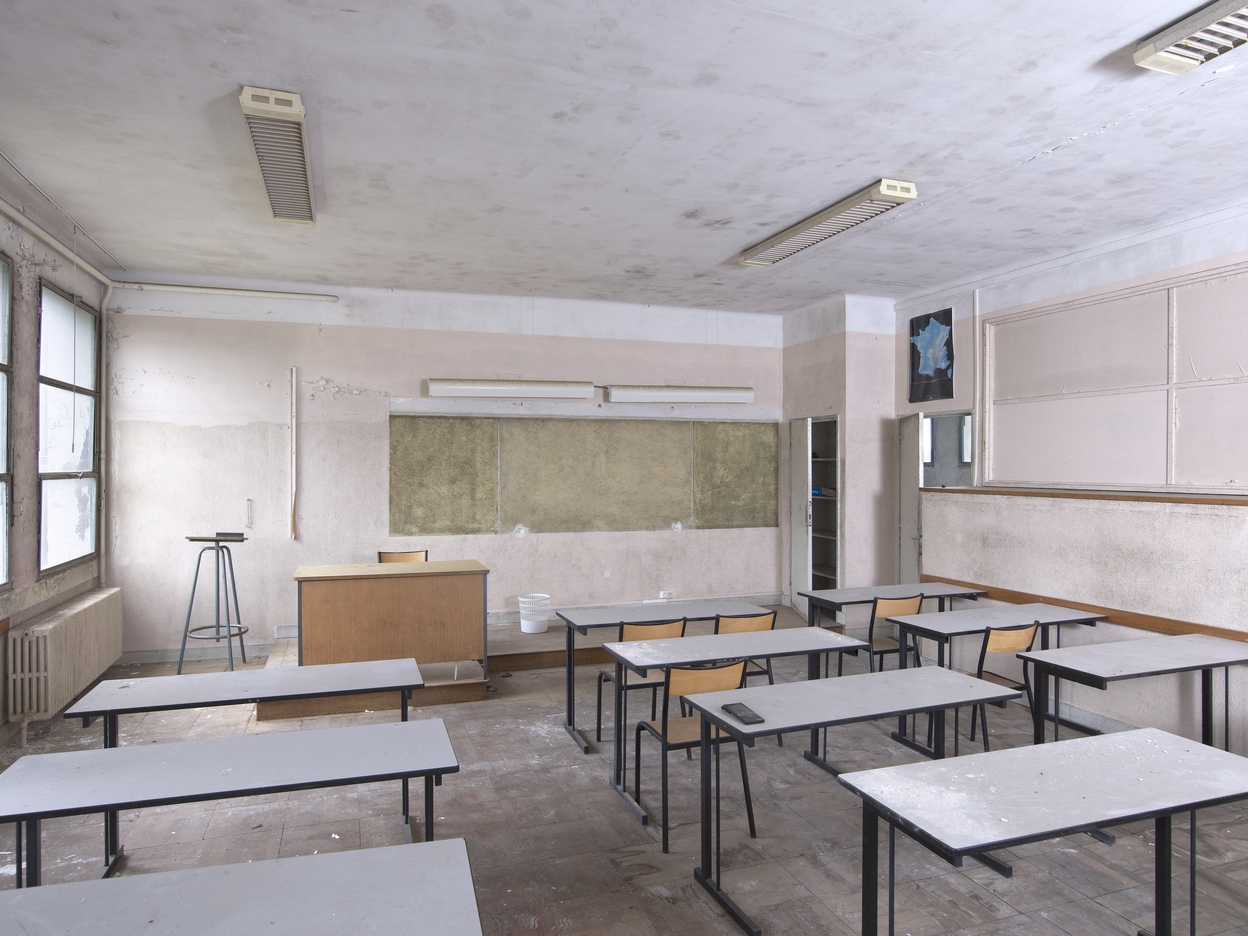 Externat B2 (désaffecté) : salle de classe au sol en parquet, avec estrade, encore meublée : noter entre autres le support de rétroprojecteur et les rangées d'éclairage néon.Immatriculation