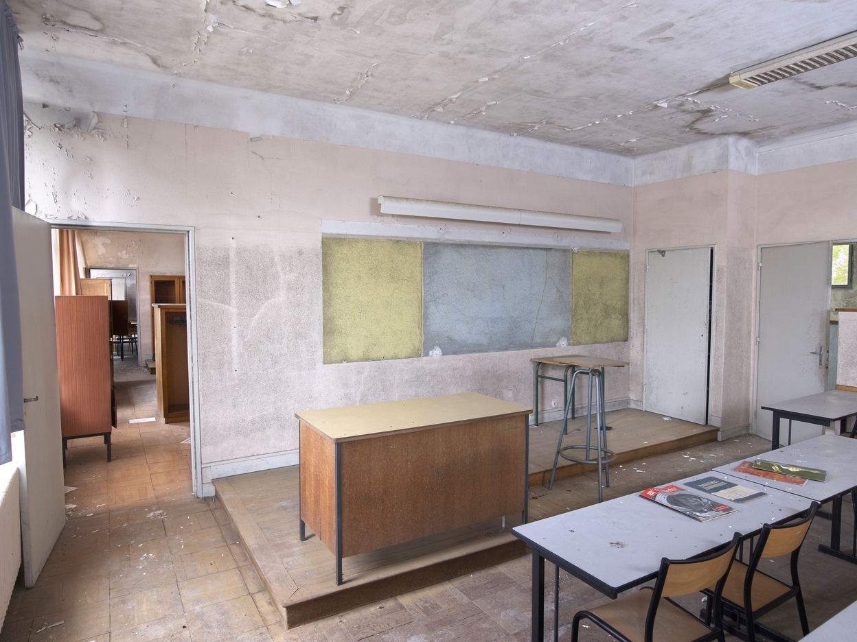 Externat B2 (désaffecté) : salle de classe au sol en parquet, avec estrade, encore meublée. Noter l'enfilade de salles de classe à travers les portes ouvertes.Immatriculation