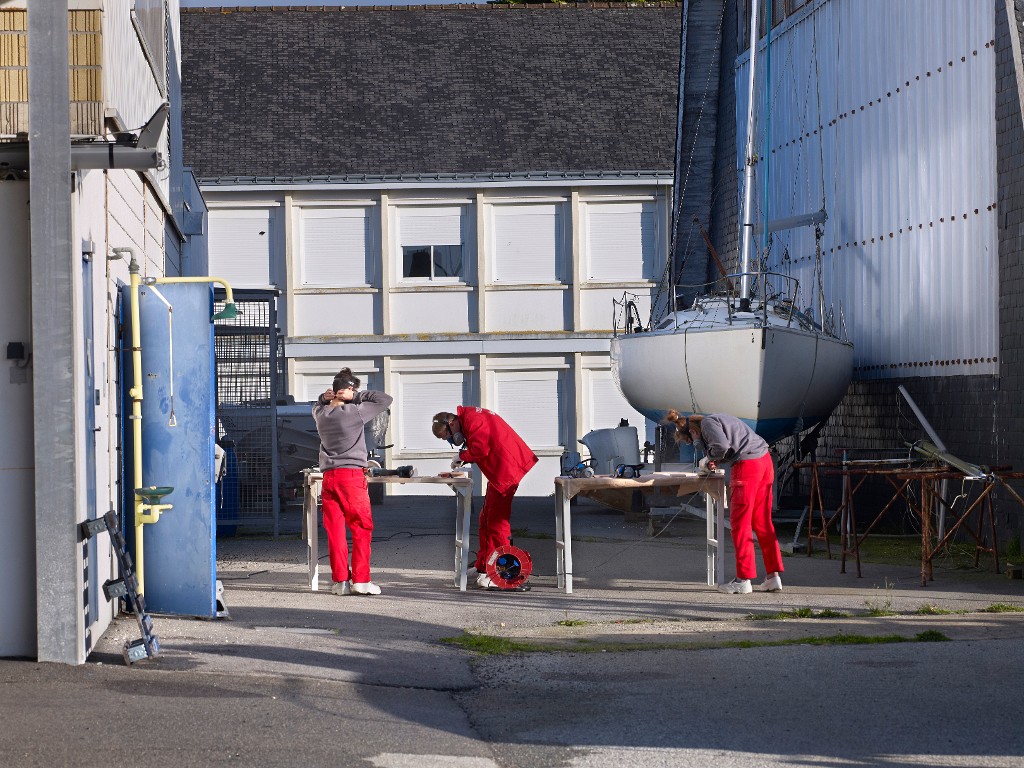 Espace de travail extérieur, entre l'atelier bateau et le gymnase (détruit en 2024). A l'arrière plan, façade ouest de l'internat.Immatriculation