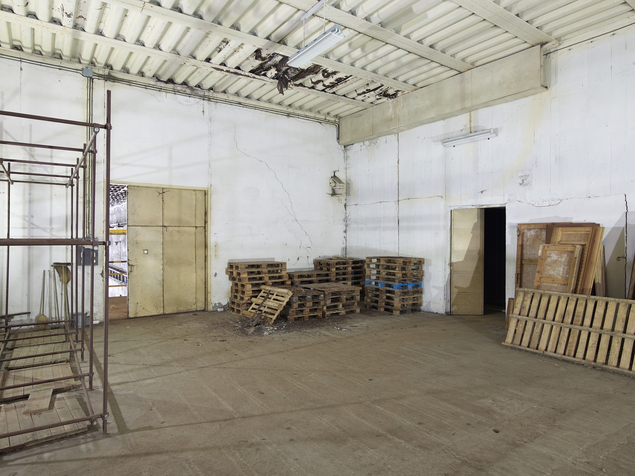 Vue du magasin sud situé au premier étage : la porte donne sur l'avancée surplombant la rue. Le magasin conserve des étagères tubulaires et des palettes en boisImmatriculation