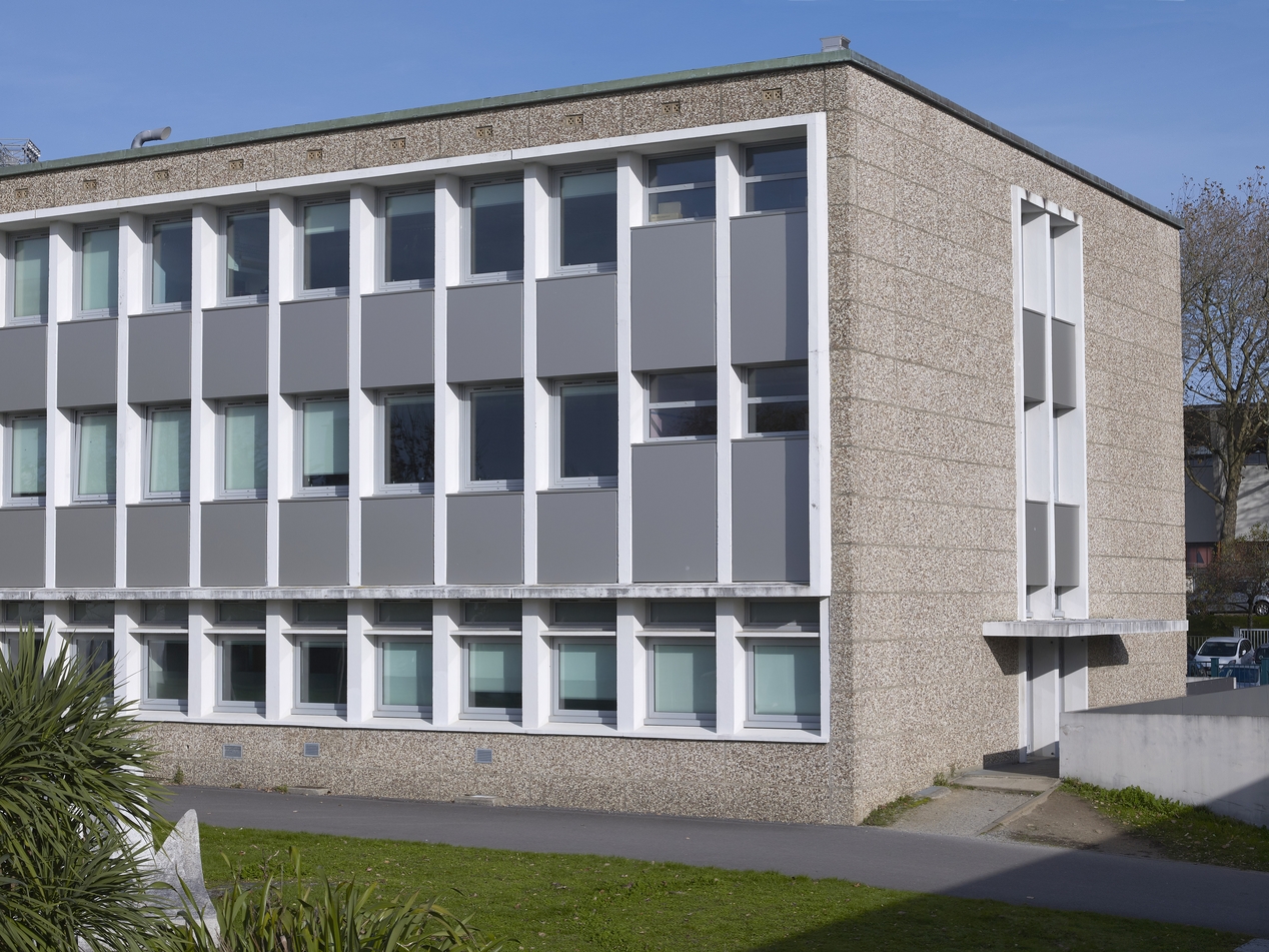 Bâtiment scientifique, angle sud. Noter le soin apporter au traitement de la travée et de l'entrée dans le pignon.Immatriculation