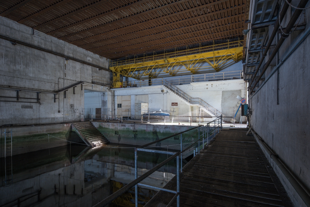 Vue du fond de l'alvéole sud. Au premier plan à droite, platelage en bois du quai et son garde-corps. Peint en jaune, le pont roulant LevmanImmatriculation