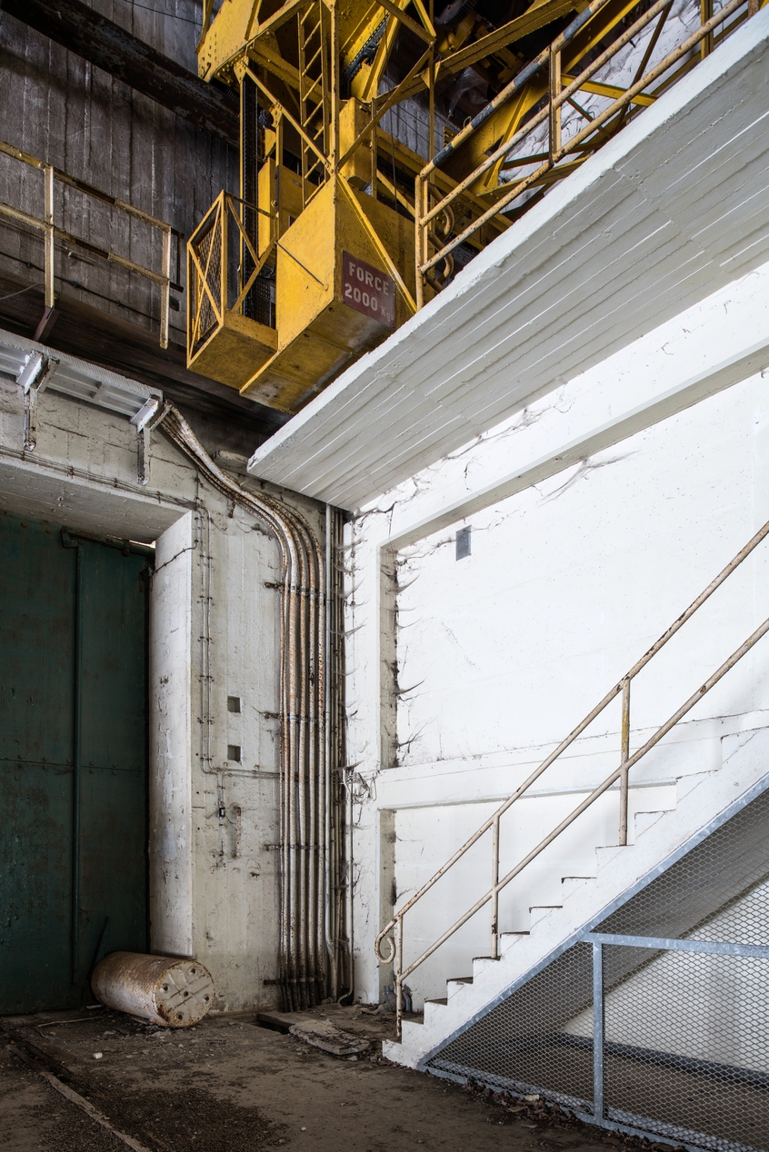 Vue du fond de l'alvéole nord (dans le renfoncement du mur, la porte blindée nord) : escalier donnant accès au premier étage. Sur le mur, le réseau électrique d'origine. Peint en jaune, le pont roulant Levman d'une capacité de 2 tImmatriculation