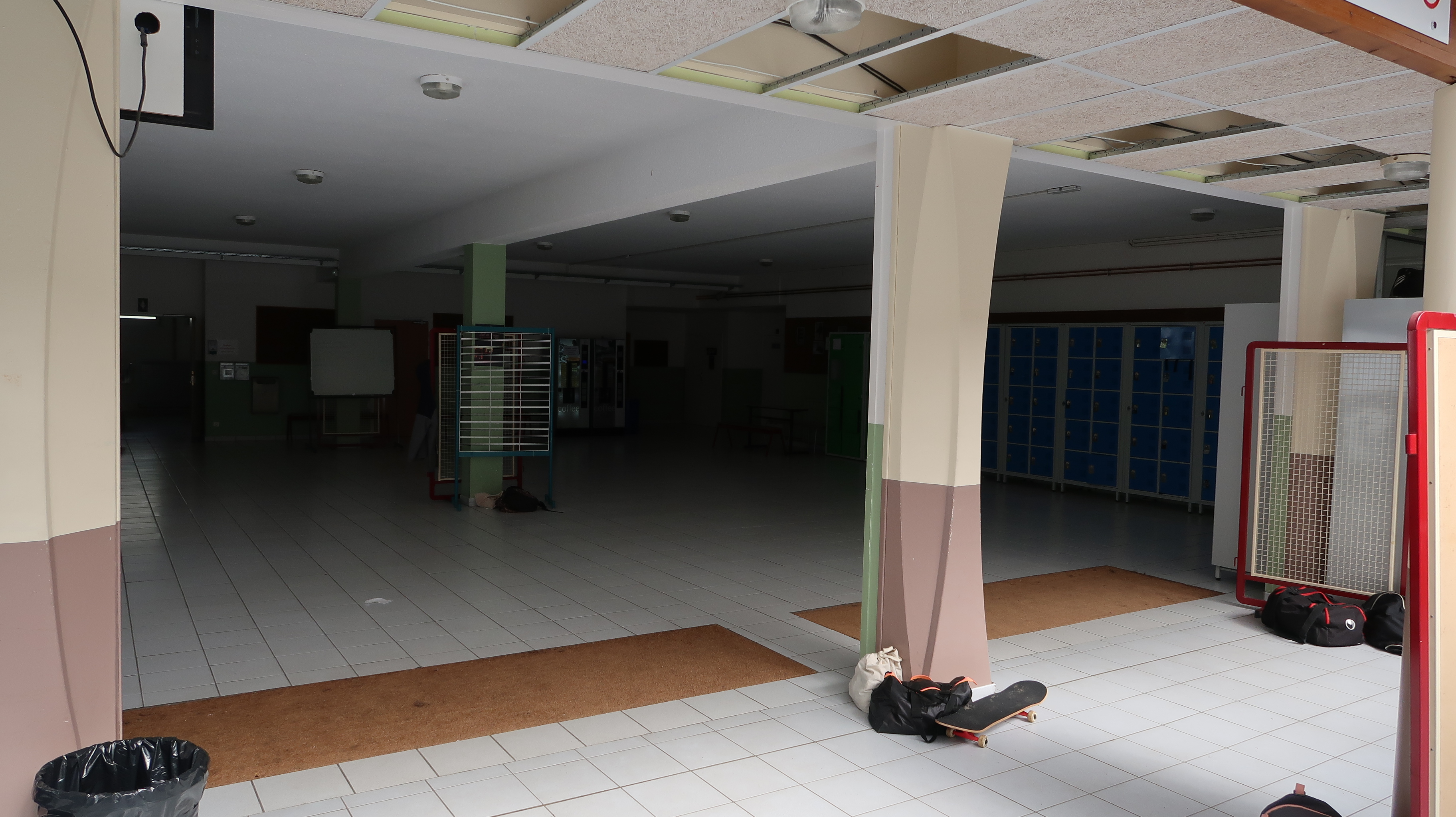 Vue intérieure du hall. Les poteaux en béton montrent la limite entre le bâti initial et son extension.Immatriculation