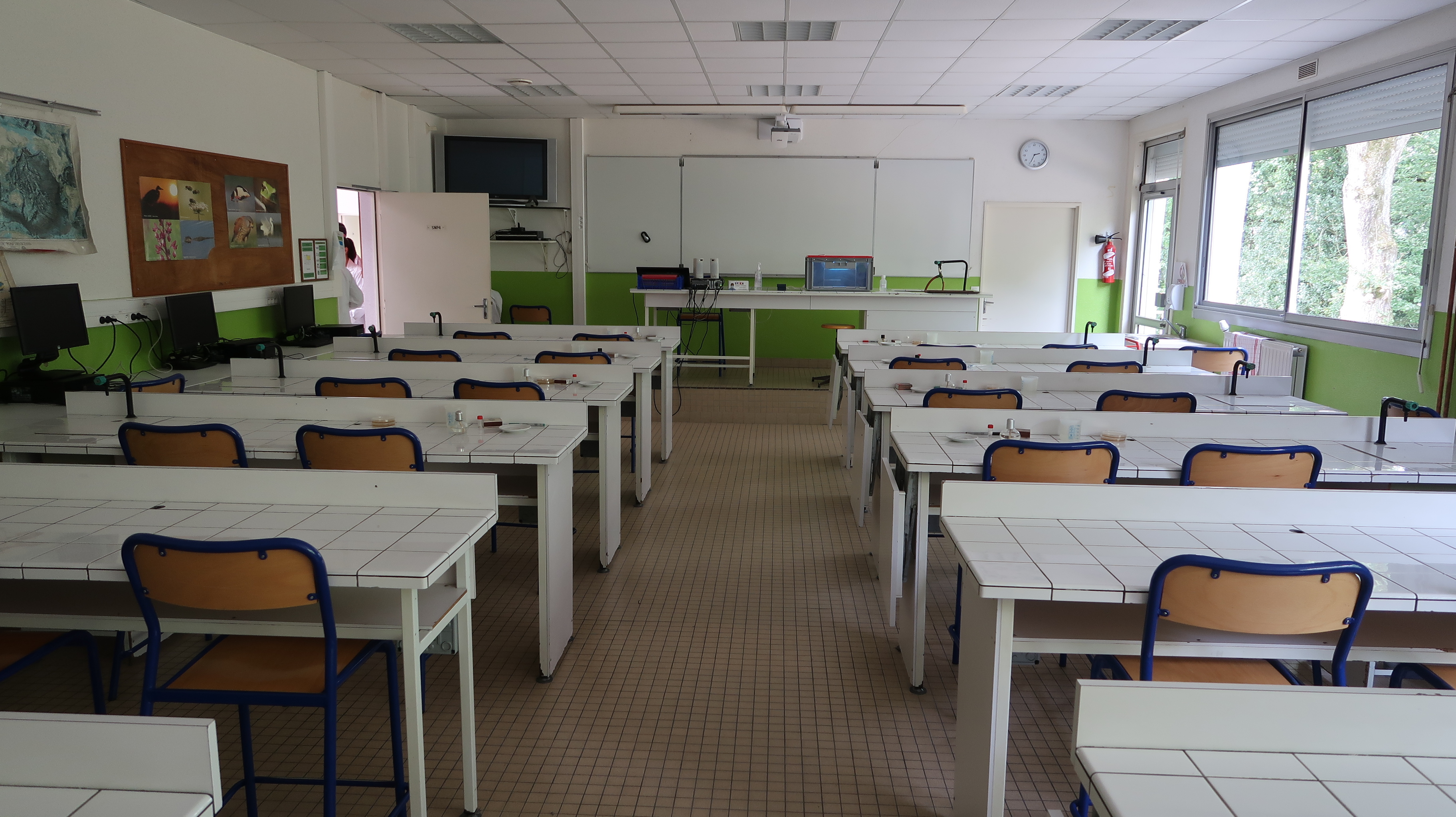 Une salle de science qui a conservé son mobilier d'origine.Immatriculation