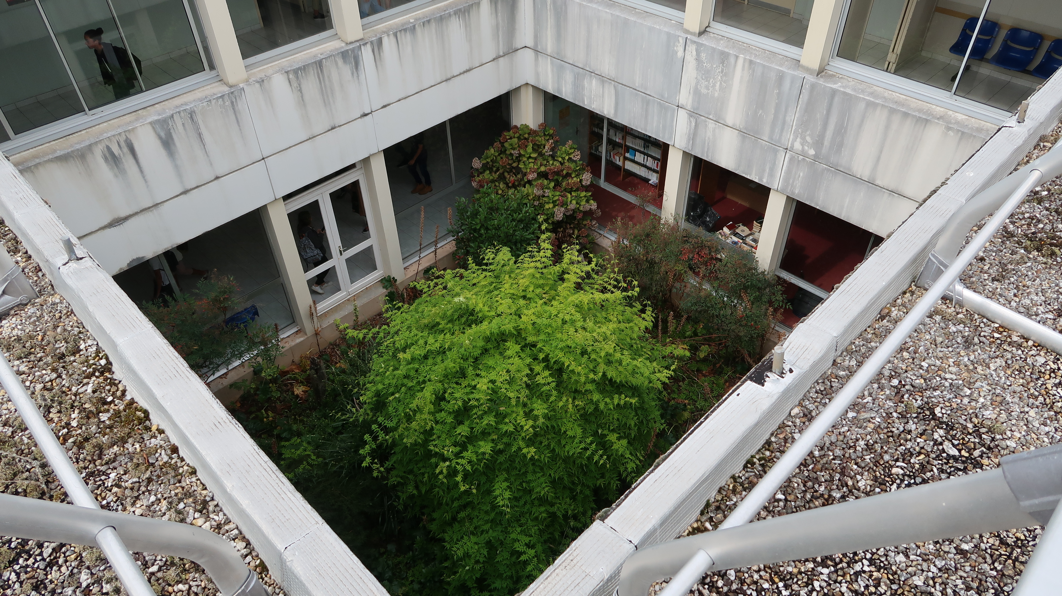 Le patio qui éclaire, entre autres, le CDI, vu des toits.Immatriculation