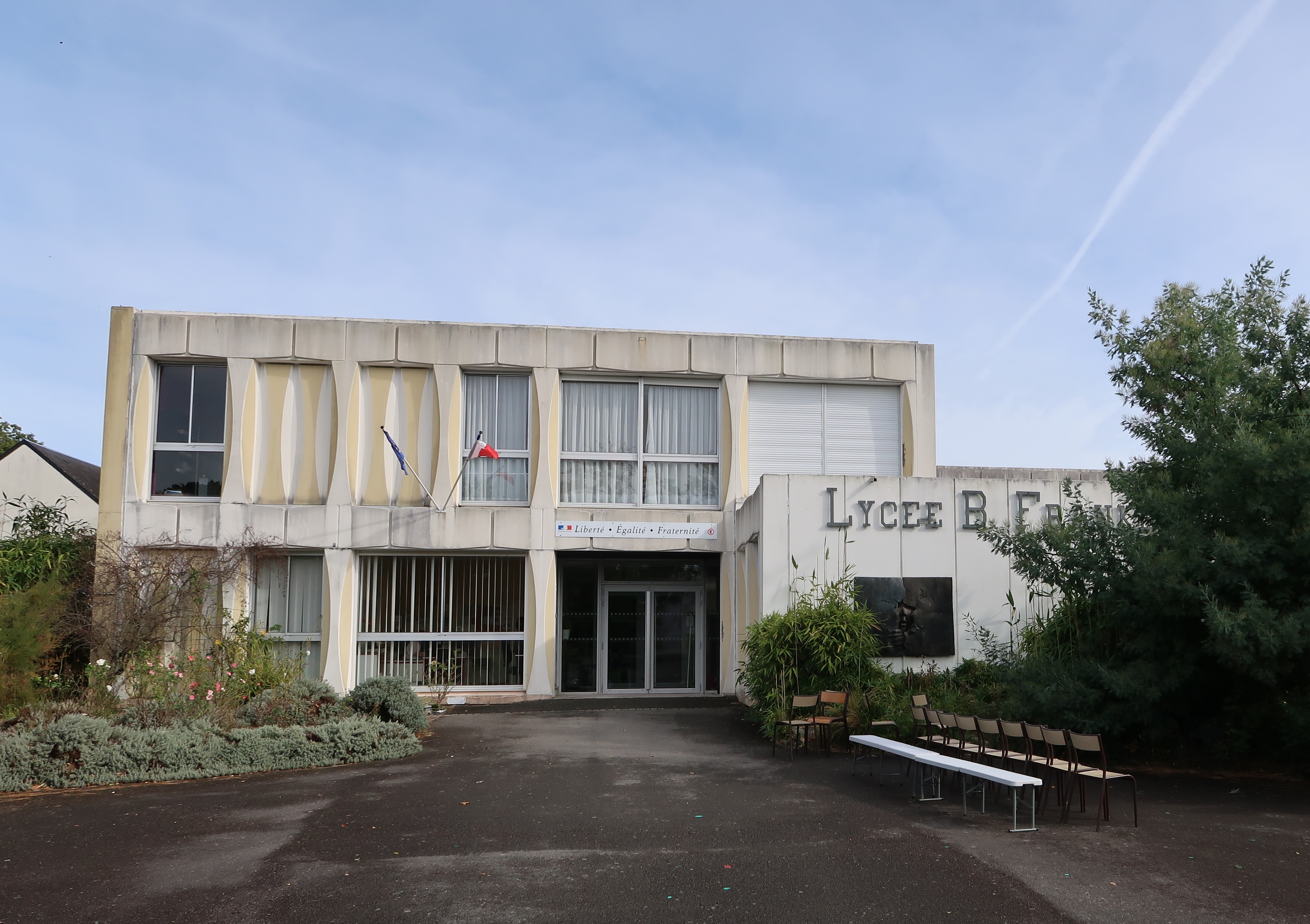 L'entrée du lycée (bâtiment administratif. Sur le mur, à droite, le bas-relief en bronze de Martine Kerbaol, dans son contexte en 2019.Immatriculation
