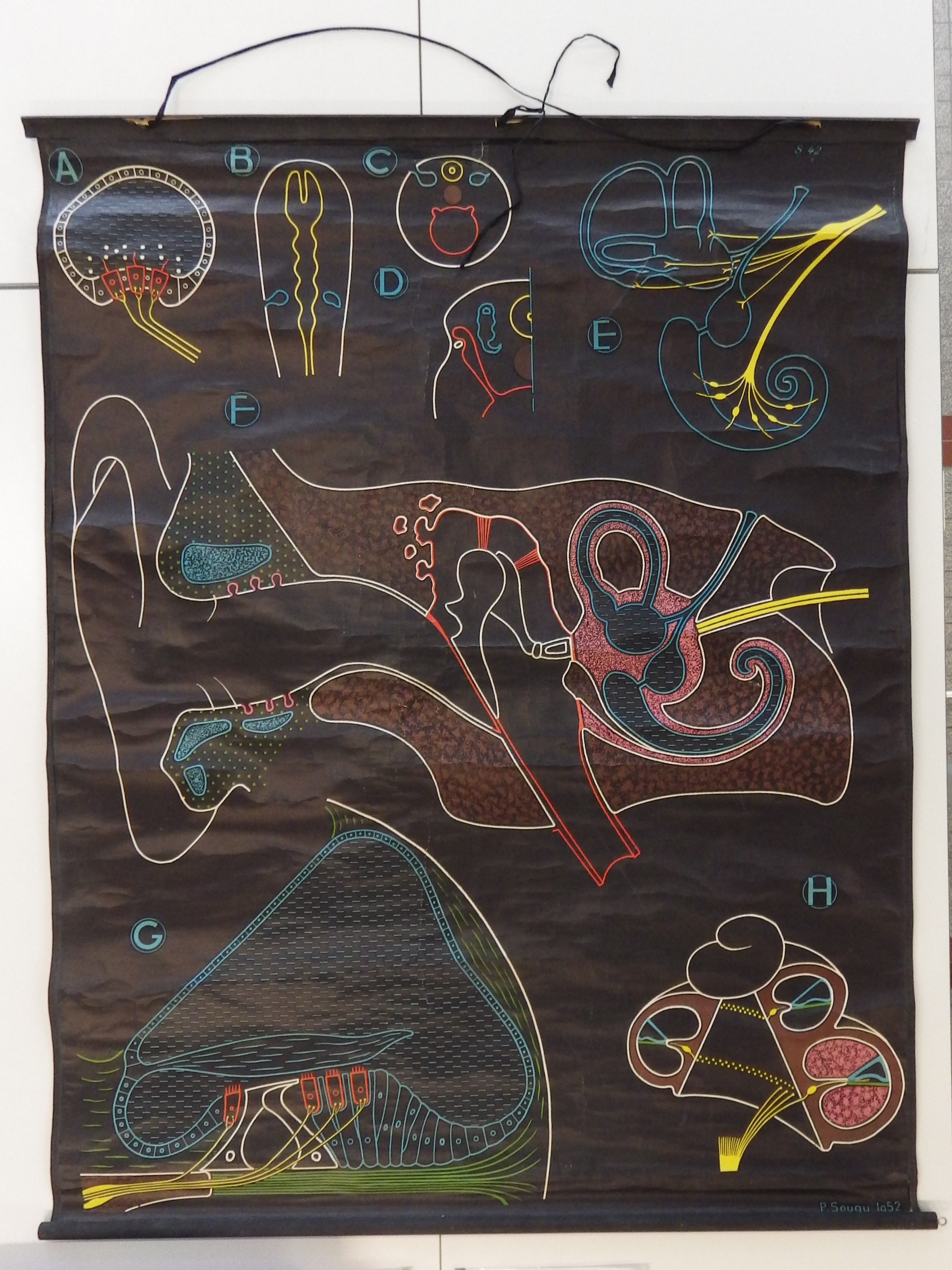 L’oreille - Collection de planches pédagogiques (Schémas didactiques dessinés par P. Sougy, Ed. les Etablissements du Dr Auzoux, 1952)Immatriculation