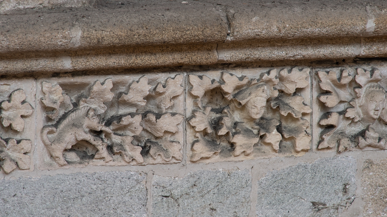 Détail de la frise sculptée en calcaire soulignant le triforiumImmatriculation