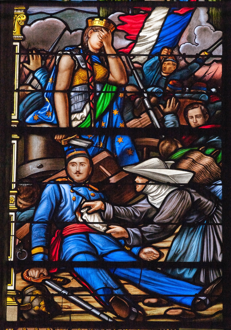 Détail de la verrière du voeu de la guerre : en arrière-plan de la scène de bataille, une femme représentant la France se cache les yeuxImmatriculation