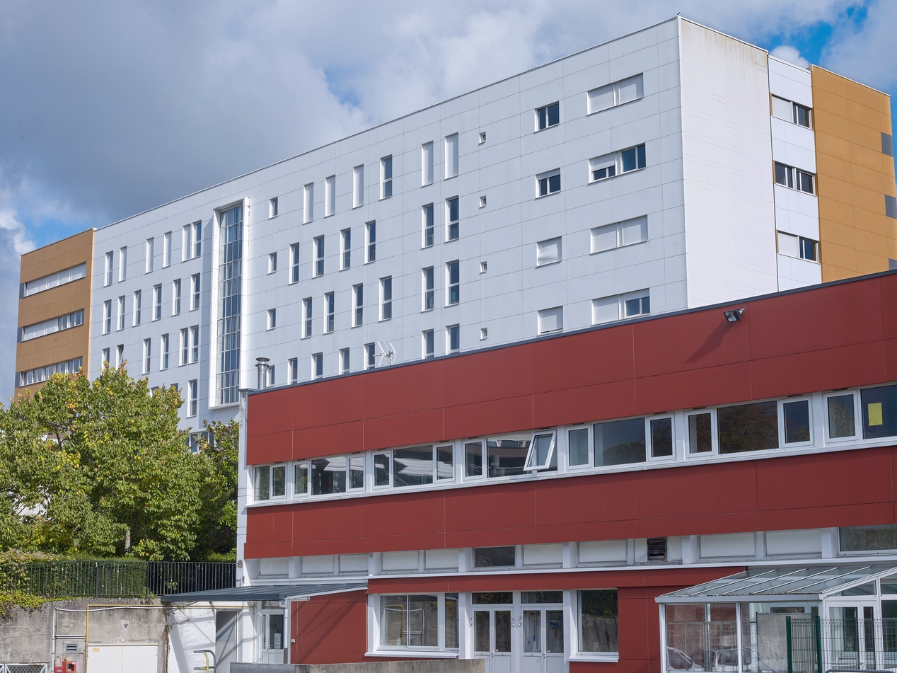 Bâtiment B (internat, logements, classes) et, au premier plan, bâtiment C (restauration, infirmerie, foyer), façades ouest. André Remondet et Patrice Simon, architectes, 1966.Immatriculation