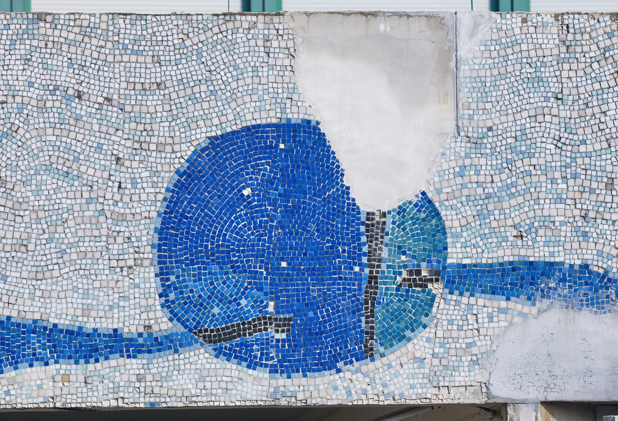 Détail de la mosaïque monumentale de Gustave Singier (1962), sur le garde-corps de la cour située en rez-de-chaussée haut.Immatriculation