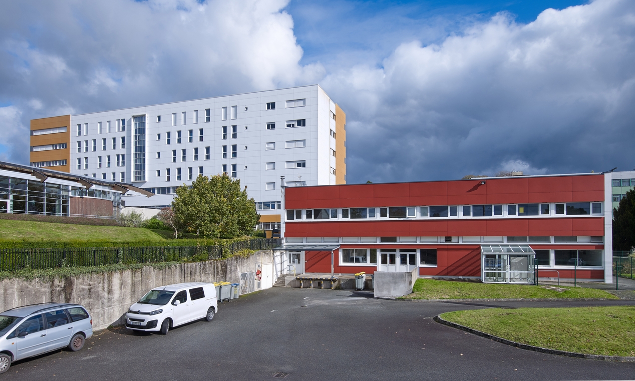 Vue d'ensemble prise de l'ouest. De gauche à droite : piscine (extension 2002, Jean-Yves Philippe et Jacky Grimault, architectes), bâtiment B (internat, logements, classes), bâtiment C (restauration, infirmerie, foyer). André Remondet et Patrice Simon, architectes, 1966.Immatriculation