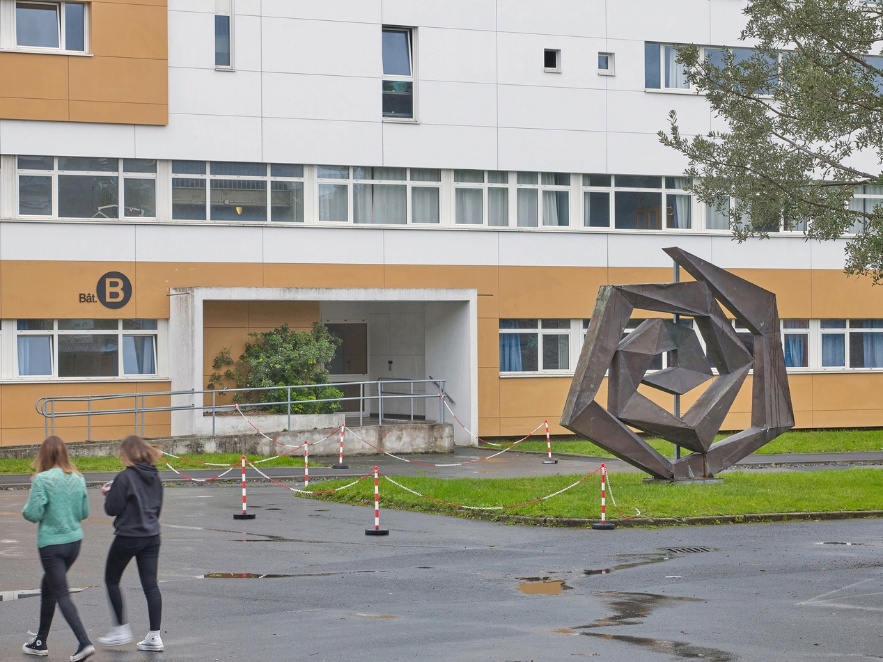 Bâtiment B (internat, logements, classes) façade est. André Remondet et Patrice Simon, architectes, 1966. Et sculpture de Georges Delahaie : soleil celte (1972).Immatriculation