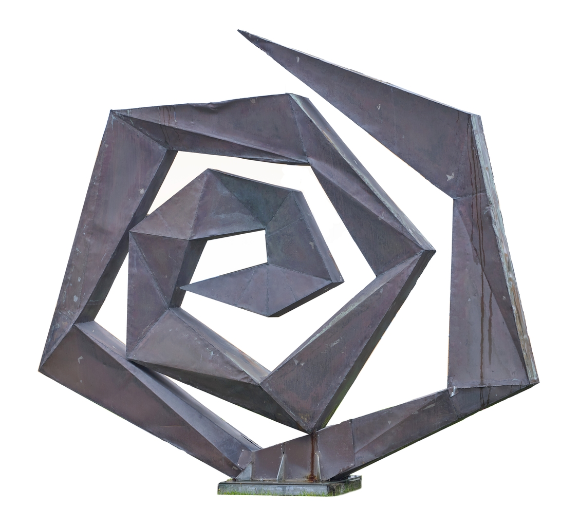 Soleil Celte. Sculpture de Georges Delahaie, en feuilles cuivre sur ossature d'acier, 1972. Vue de face, détourée.Immatriculation