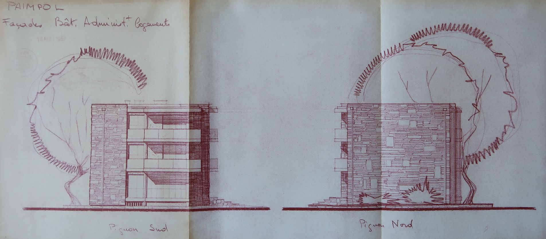 Administration, logements, pignons-sud, pignons nord. R. Hummel, R. Rolland et A. Weinstein, architectes, mai 1959.Immatriculation