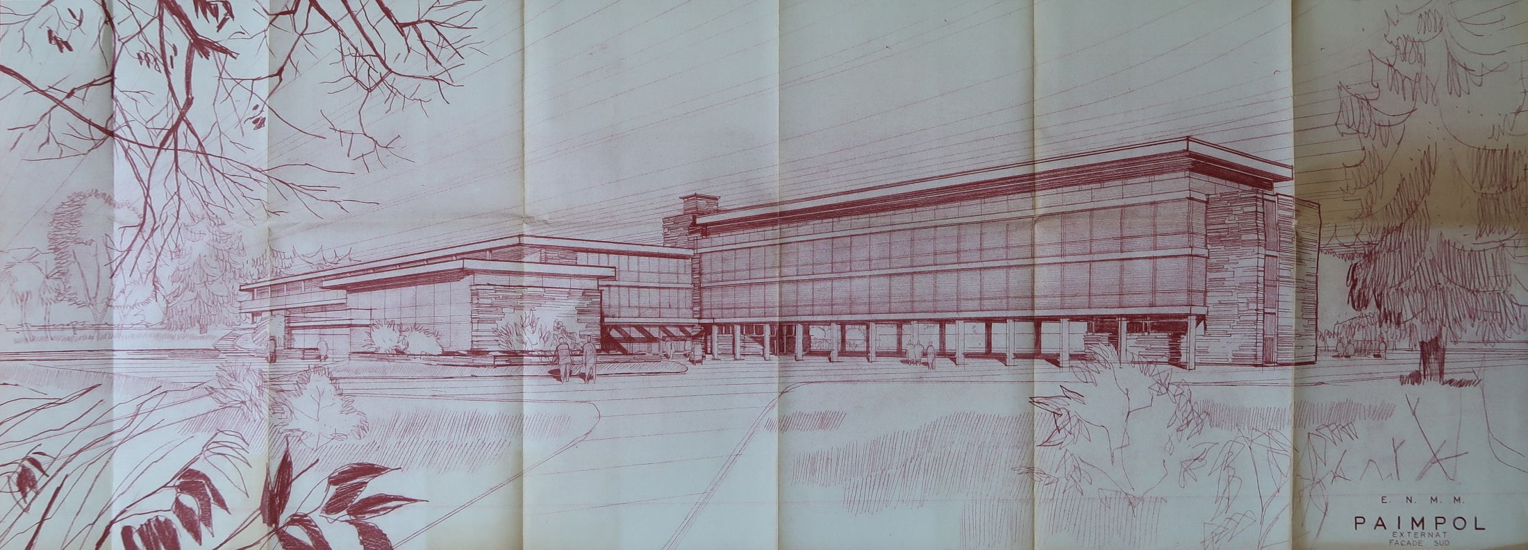 Externat, façade sud. R. Rolland et A. Weinstein, architectes, mai 1959.Immatriculation