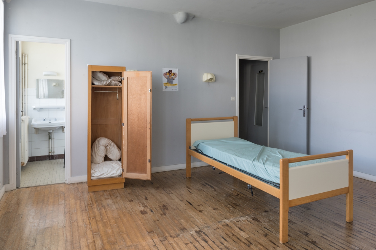 Chambre collective, initialement de six lits. Au dessus du lit, une applique holophane fournissant un éclairage individuel.Immatriculation