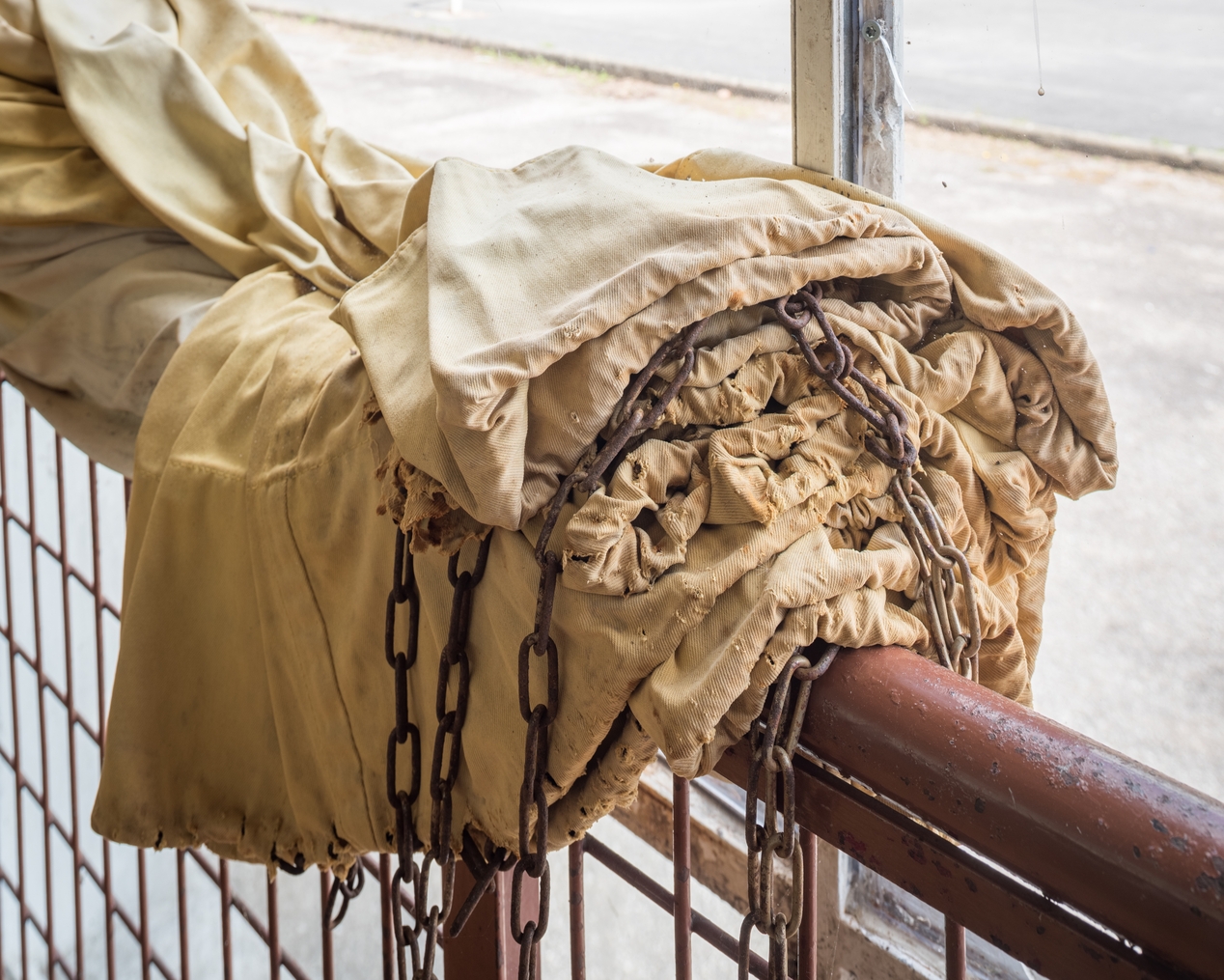 Détail sur la grille de protection de la verrière et un rideau pare-soleil.Immatriculation