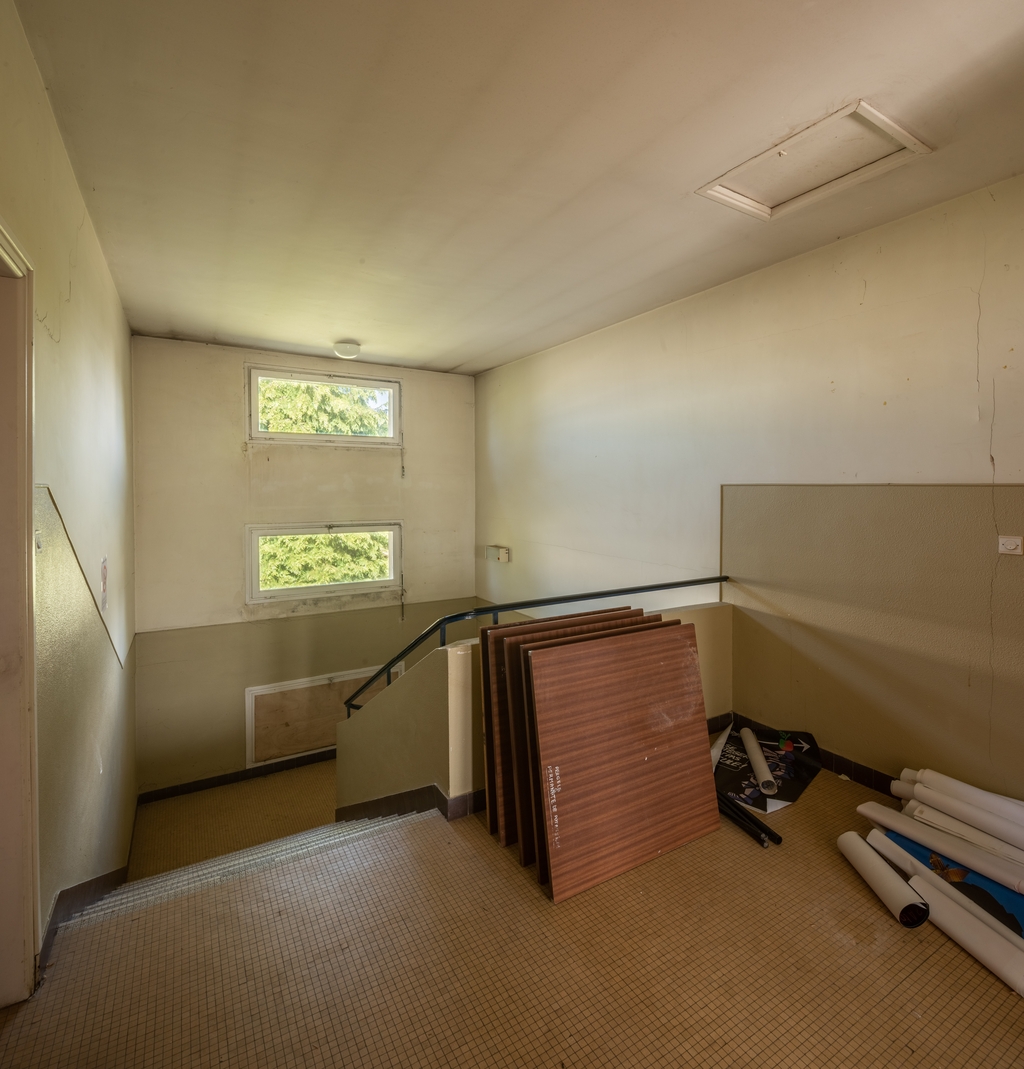 Palier et escalier, pris du 1er étage.Immatriculation