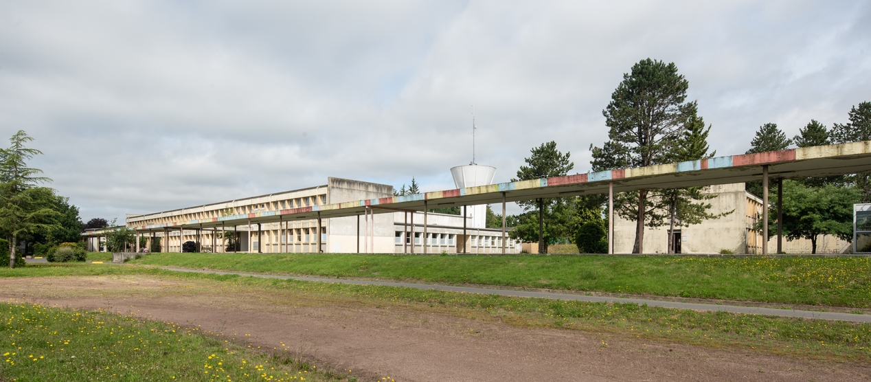 Vue d'ensemble prise du sud. Au premier plan, la galerie couverte et l'infirmerie (détruite en 2020). A l'arrière plan, à gauche, les ateliers. Péron et Weisbein, architectes, 1967-1968.Immatriculation