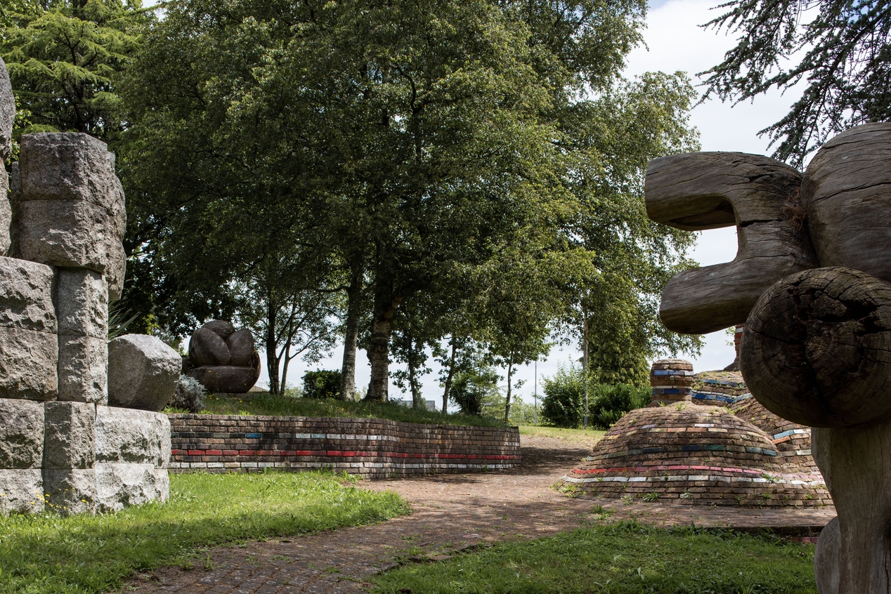 Vue d'ensemble des sculptures et des plantations. Au premier plan, de gauche à droite, sculptures de Robert Fachard, Klaus Schultze et Fumio Otani.Immatriculation