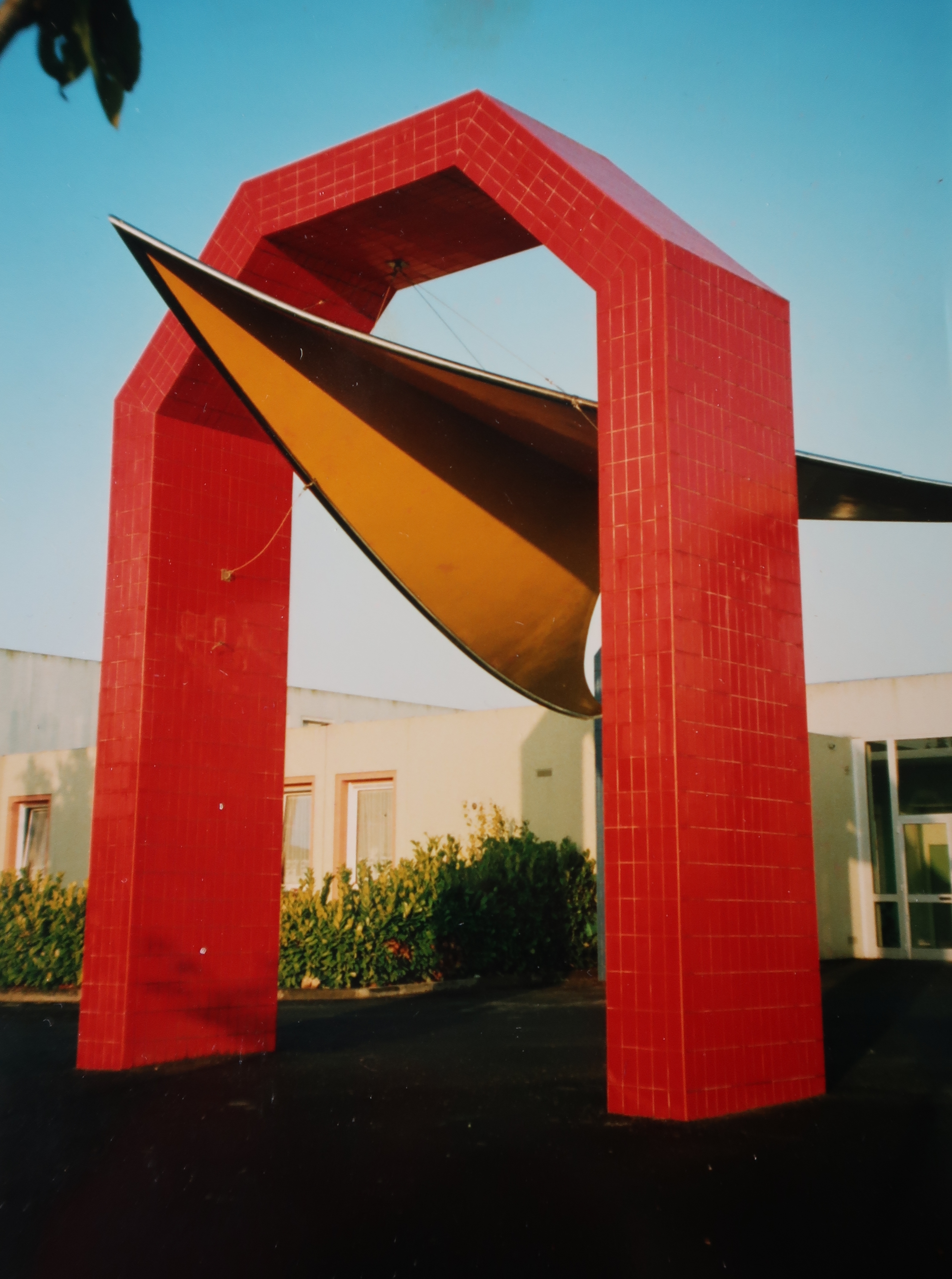 Yslav, sculpture (1% artistique), photographiée peu après son achèvement, en 1993 : la grande arche et la voile "delta".Immatriculation
