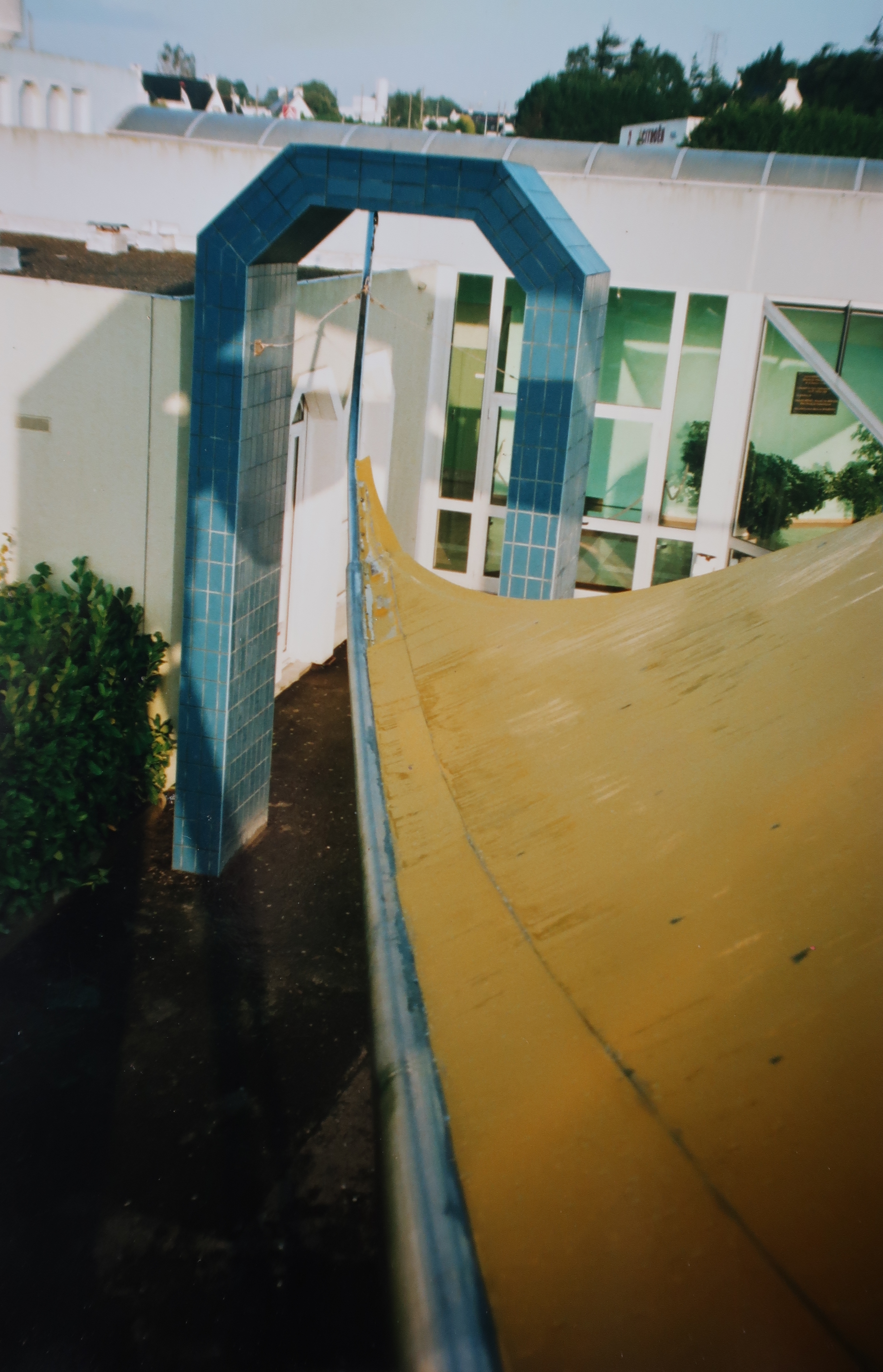 Yslav, sculpture (1% artistique), photographiée peu après son achèvement, en 1993. Vue de l'une des petites arches et d'une partie de la voile.Immatriculation