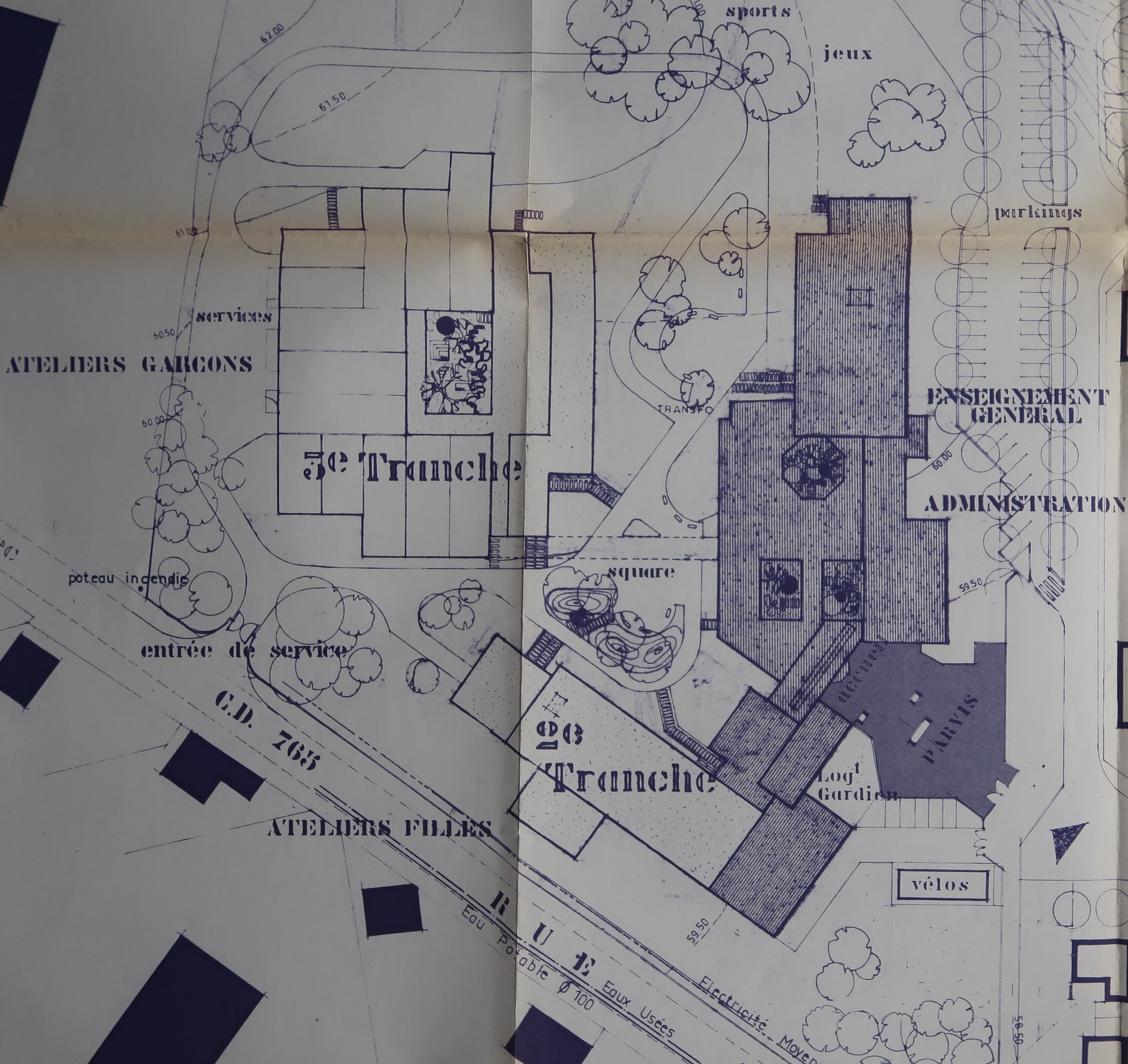 Plan de masse (sd, second semestre 1985) : Détail sur le lycée professionnel. Alain Letenneur, Michel Bignan et Jean-Pierre Brunerie, architectes.Immatriculation