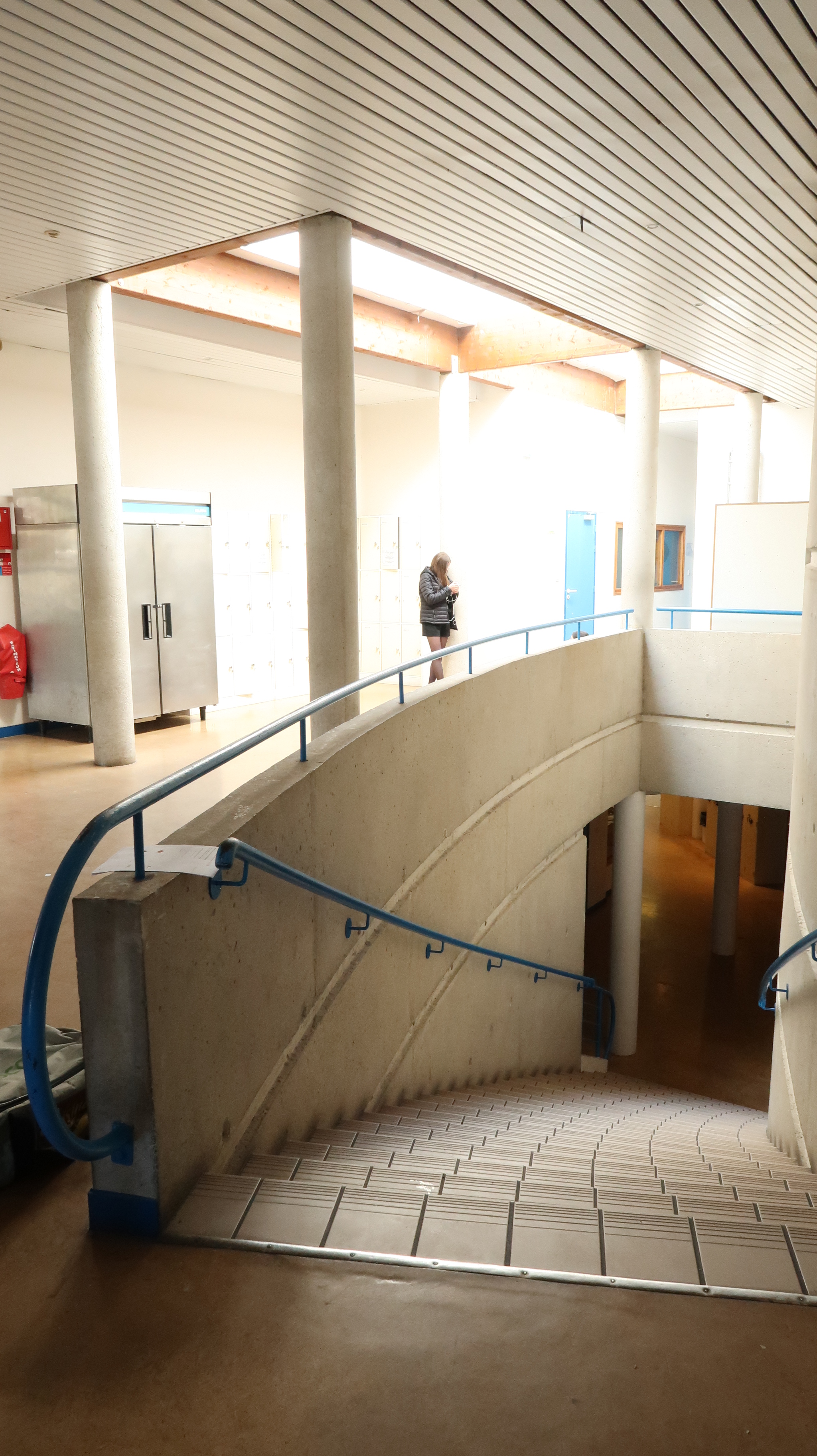 Hall et escalier vers le rez-de-chaussée bas du bâtiment des formations hôtelières. Atelier Duhamel, architectes, 1994.Immatriculation