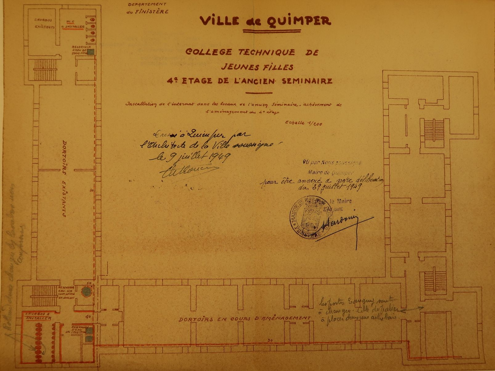 Installation de l'internat dans les locaux de l'ancien séminaire. Achèvement de l'aménagement du 4e étage. Par l'architecte de la Ville, le 9 juillet 1949.Immatriculation