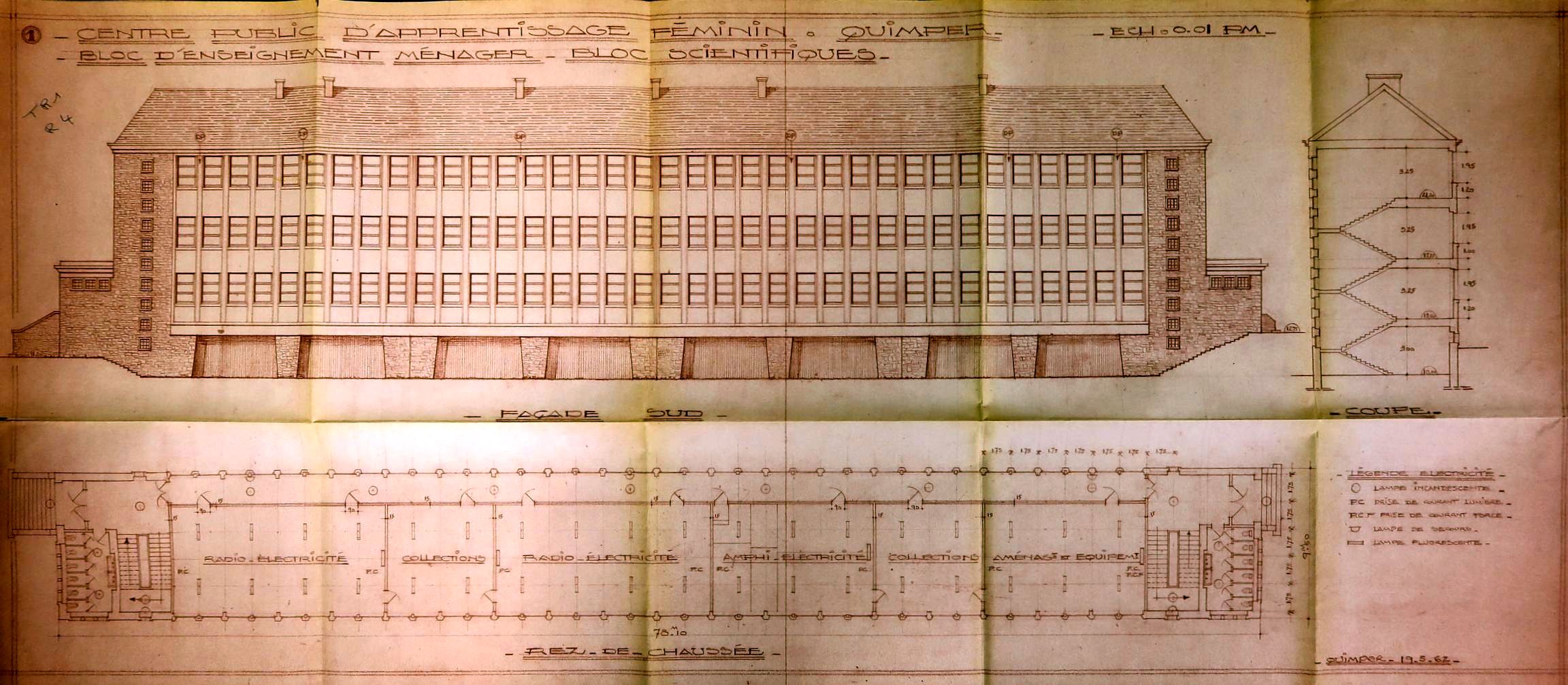 Élévation façade sud, coupe et plan du rez-de-chaussée. Centre public d'apprentissage féminin. Quimper. Bloc d'enseignement ménager. Bloc scientifique. Jacques Lachaud, architecte, 19/05/1962.Immatriculation