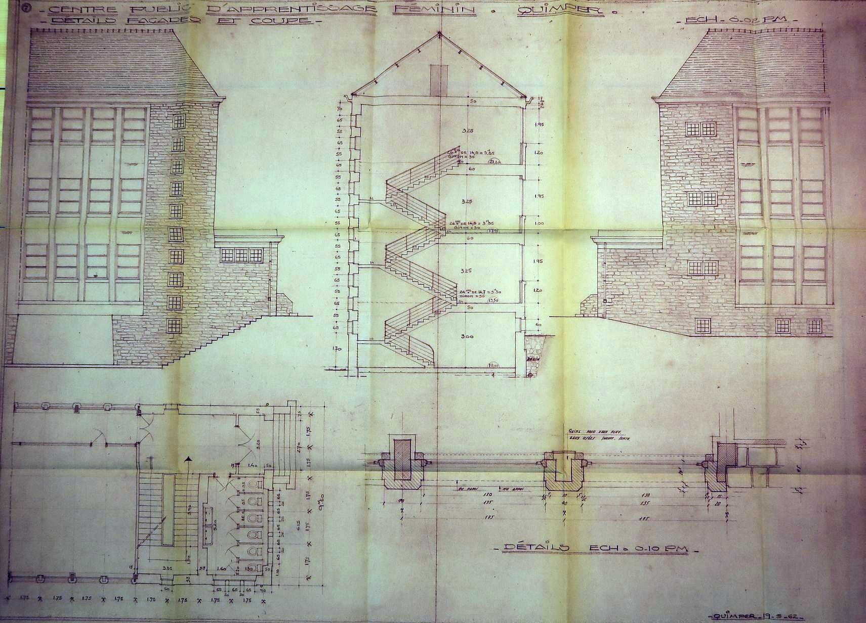 Détails façades et coupe. Centre public d'apprentissage féminin. Quimper. Jacques Lachaud, architecte, 19/05/1962. Noter le traitement de la trame d'1,75m, ainsi que le plan des escaliers et des sanitaires.Immatriculation