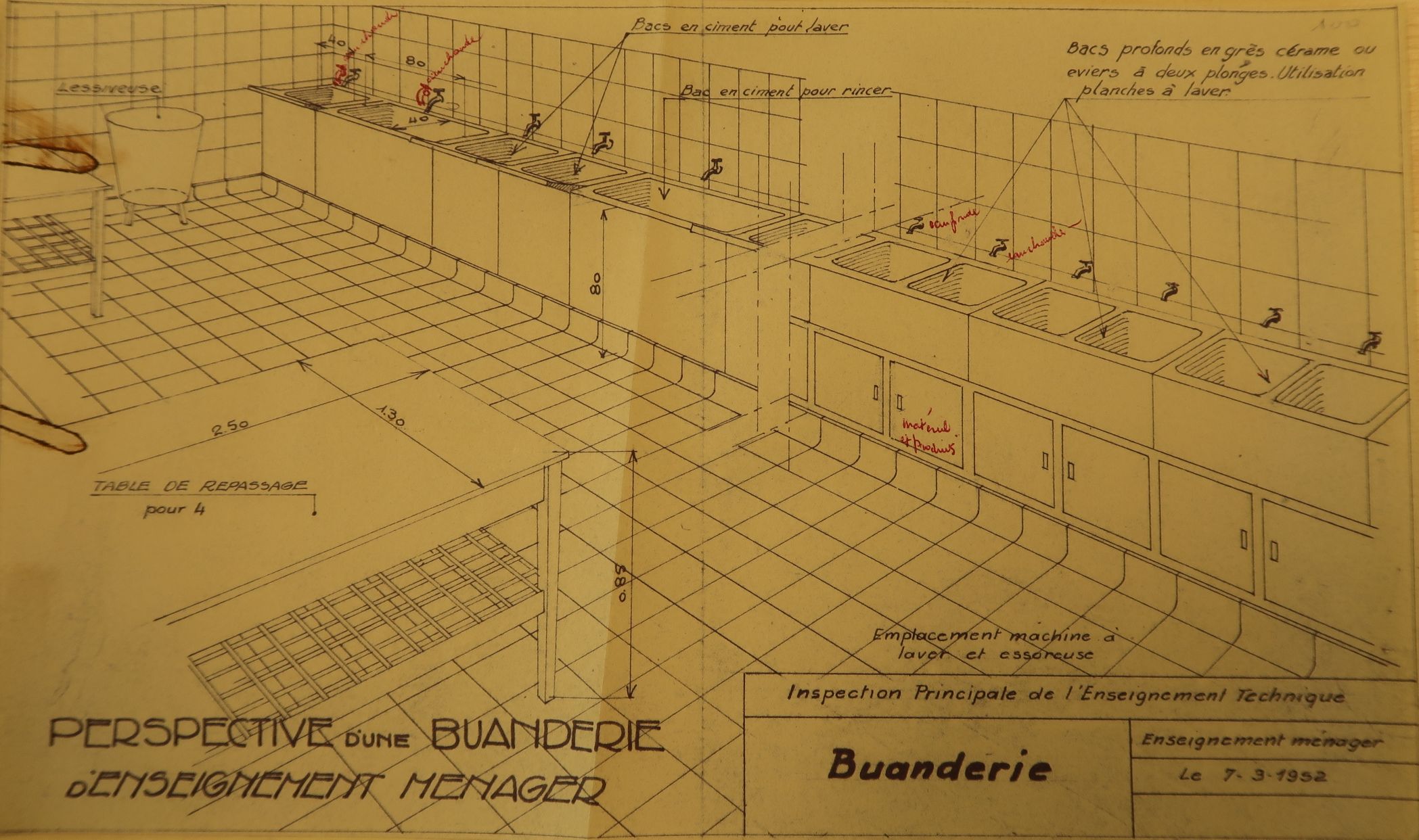 Plan type : perspective d'une buanderie d'enseignement ménager. Inspection principale de l'enseignement technique. 7.3.1952.Immatriculation