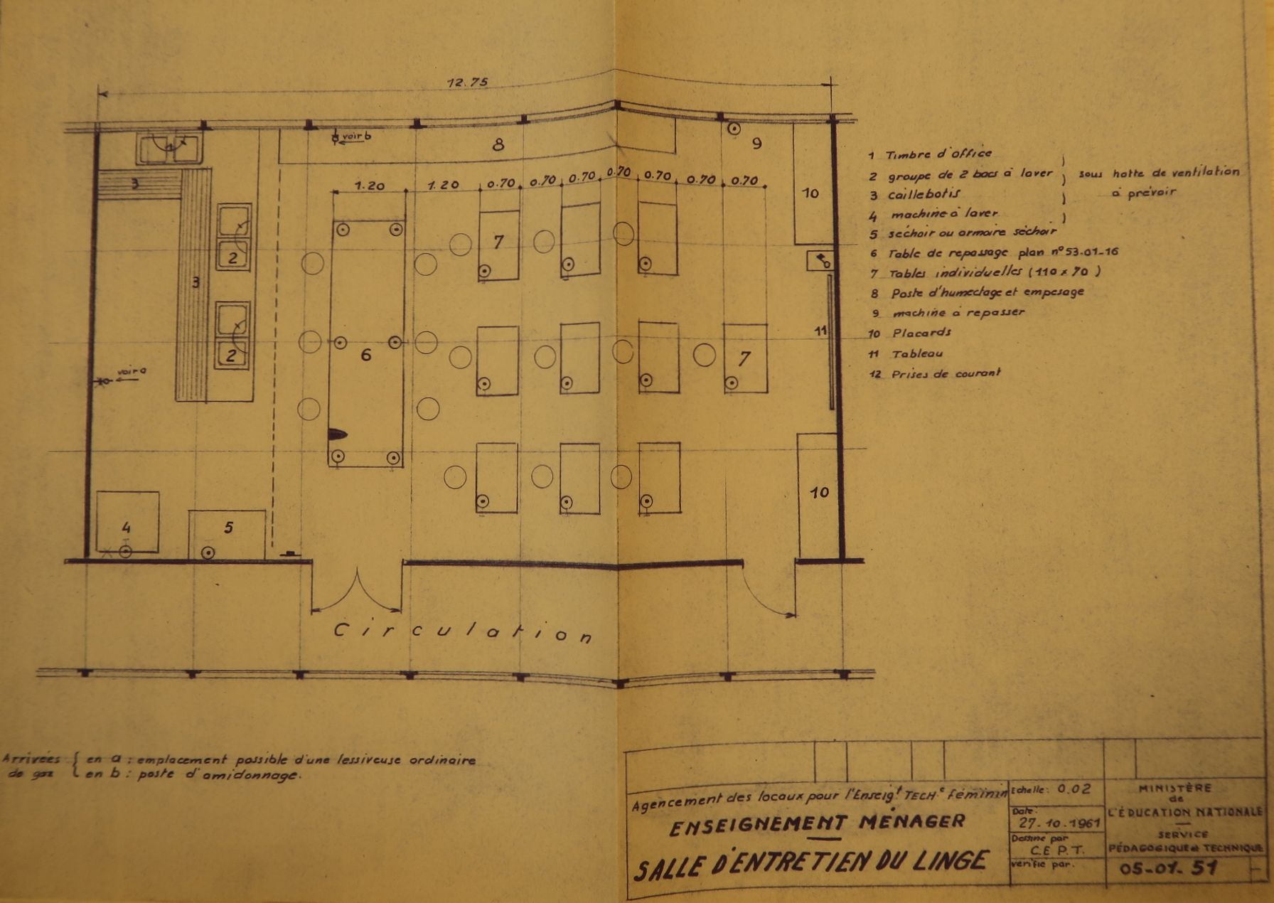 Plan type : Enseignement ménager. Salle d'entretien du linge. Ministère de l’Éducation nationale. Service pédagogique et technique. 05/01/1951.Immatriculation