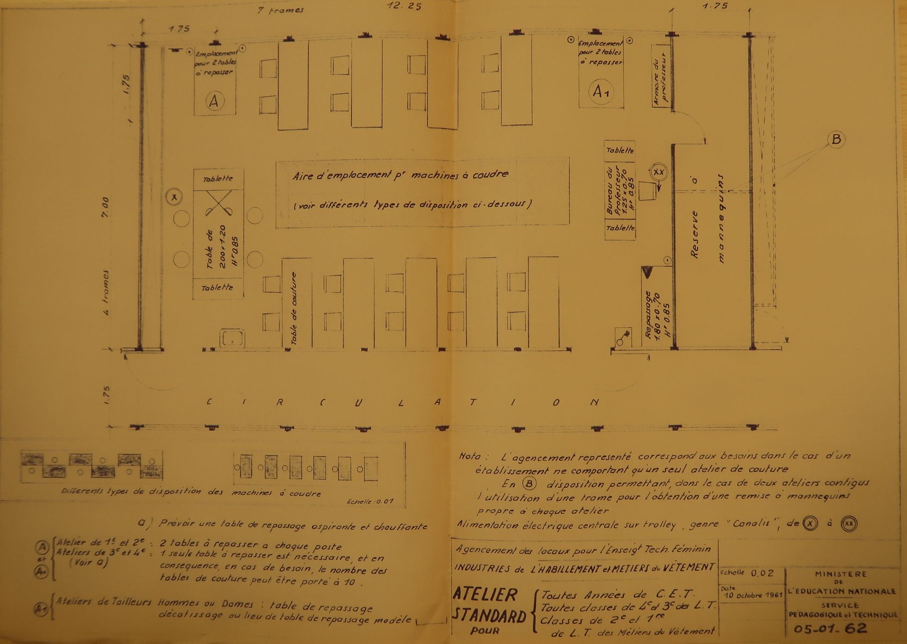 Plan type. Atelier standard. Agencement des locaux pour l’enseignement technique féminin. Industries de l'habillement et du vêtement. Ministère de l’Éducation nationale. Service pédagogique et technique. 05.01.1962.Immatriculation