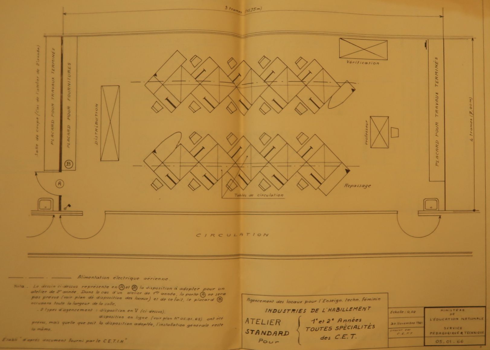 Plan type. Atelier standard 1e et 2e années toutes spécialités des C.E.T. Agencement des locaux pour l’enseignement technique féminin. Industries de l'habillement. Ministère de l’Éducation nationale. Service pédagogique et technique. 05.01.1966Immatriculation