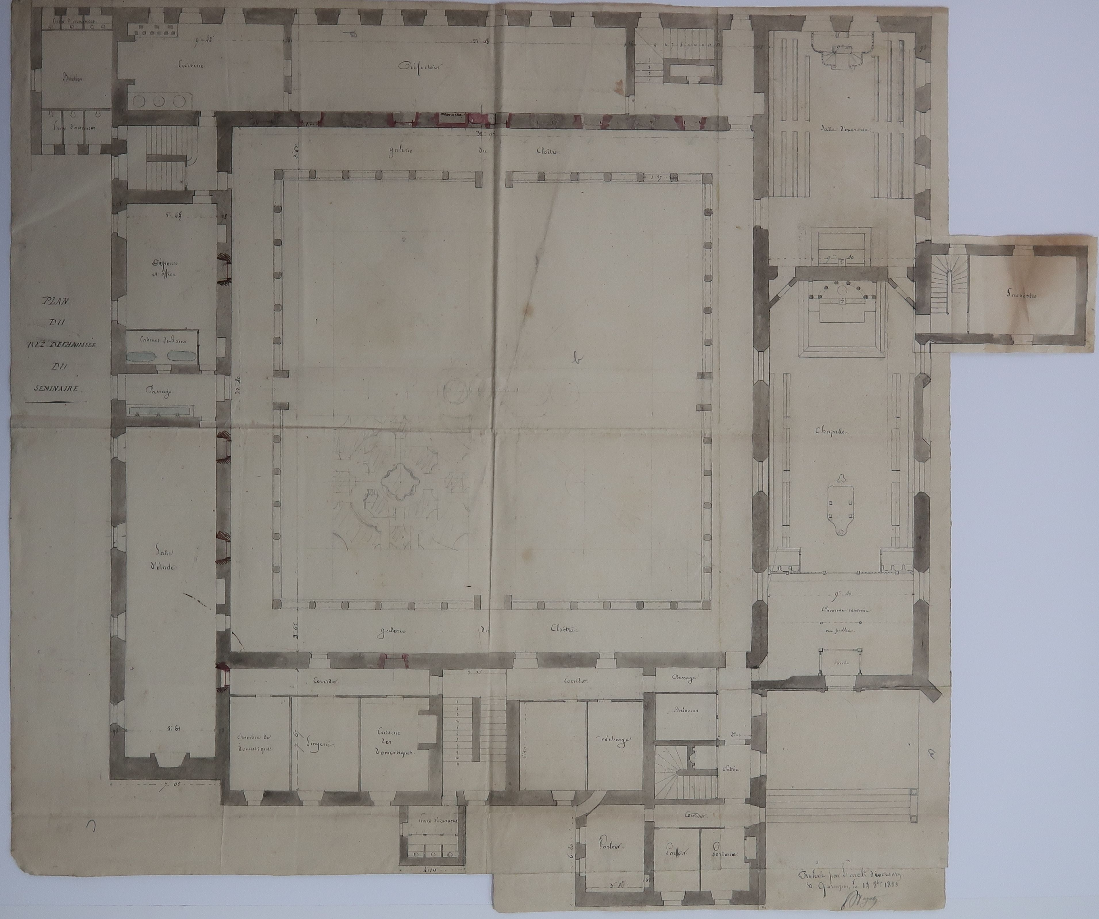 Plan du rez-de-chaussée du séminaire, par Joseph Bigot, octobre 1859. Etat avant les travaux de reconstruction de trois des ailes. Dans le prolongement de la chapelle, la salle pour s'exercer à la célébration de la messe.Immatriculation