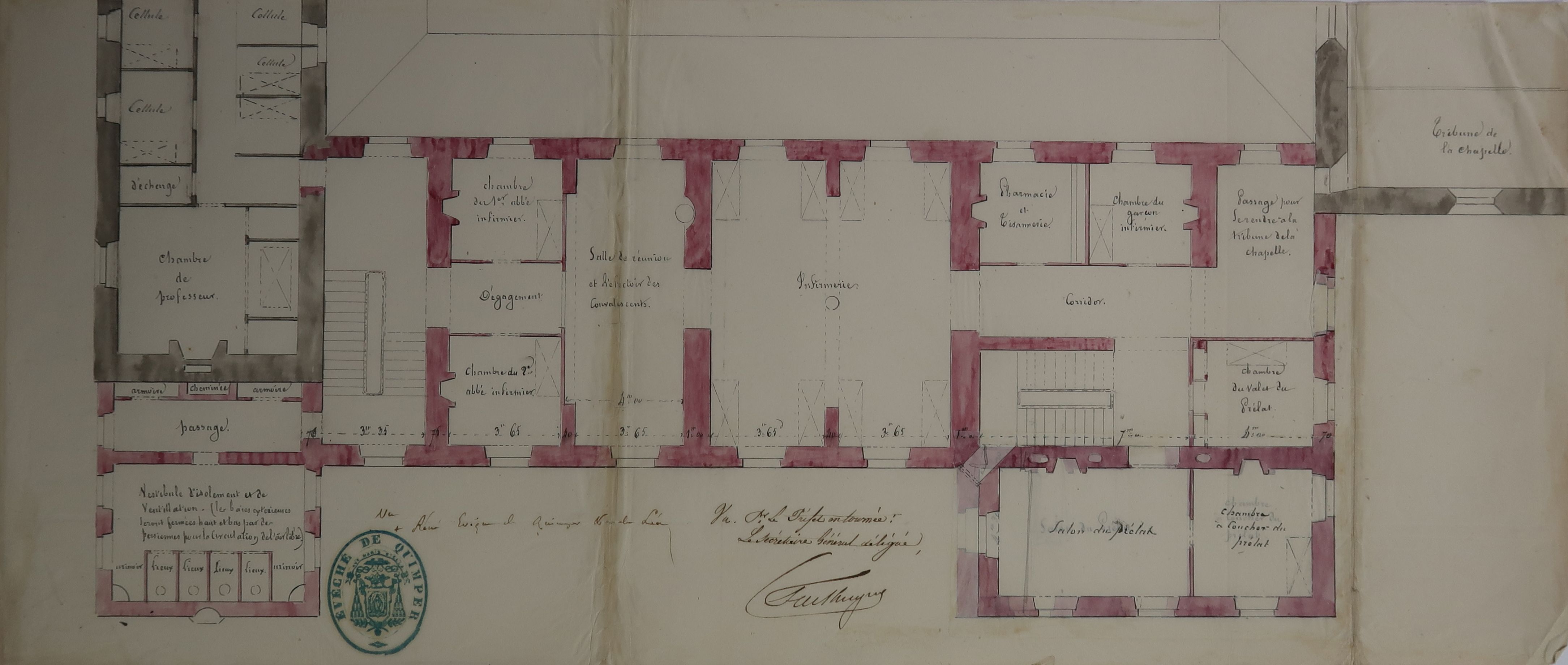 Plan du premier étage de l'aile nord-est. Joseph Bigot architecte, SD (vers 1855) : appartements du prélat et de son valet, infirmerie, chambres des abbés infirmiers et "lieux", in fine implantés ailleurs.Immatriculation