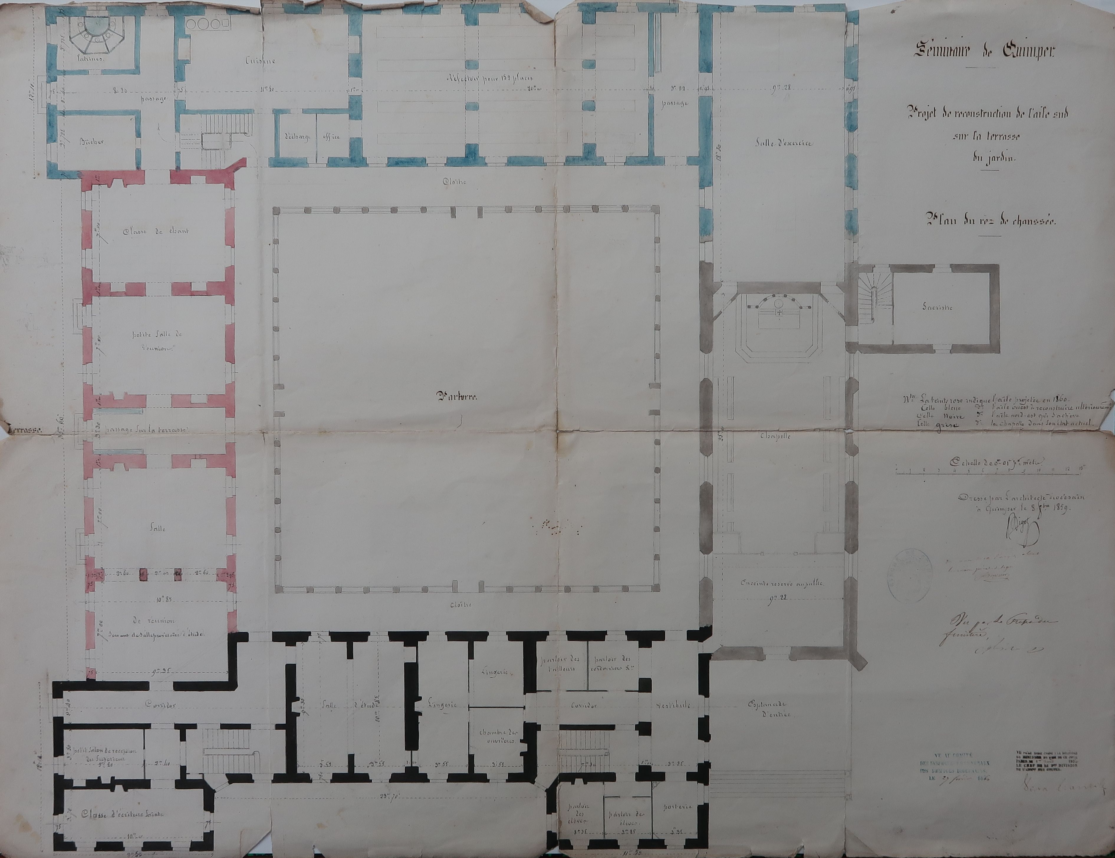 Plan du rez-de-chaussée, validé par le comité des inspecteurs généraux des édifices diocésains en 1860. Joseph Bigot, architecte. En noir, l'aile en cours de construction : différents parloirs, lingerie, salle d'étude, classe d'écritures saintes... en rouge et bleue, les ailes projetées. L'aile en bleue ne sera reconstruite qu'ultérieurement par l'architecte Henri Rapine.Immatriculation