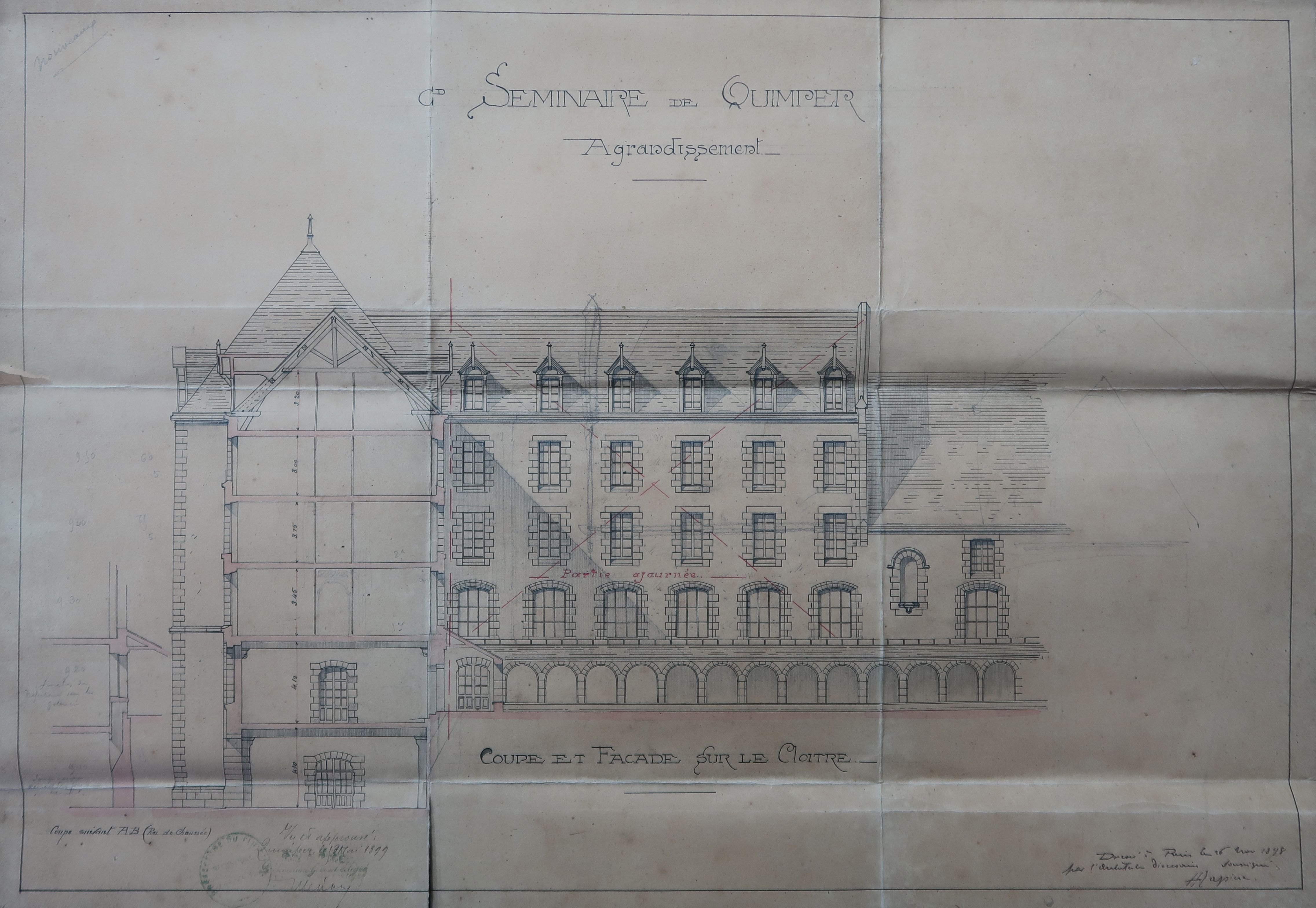 Grand Séminaire. Projet d'agrandissement. Coupe et façade sur le cloitre. Henri Rapine, architecte, 1898. Noter la partie ajournée.Immatriculation