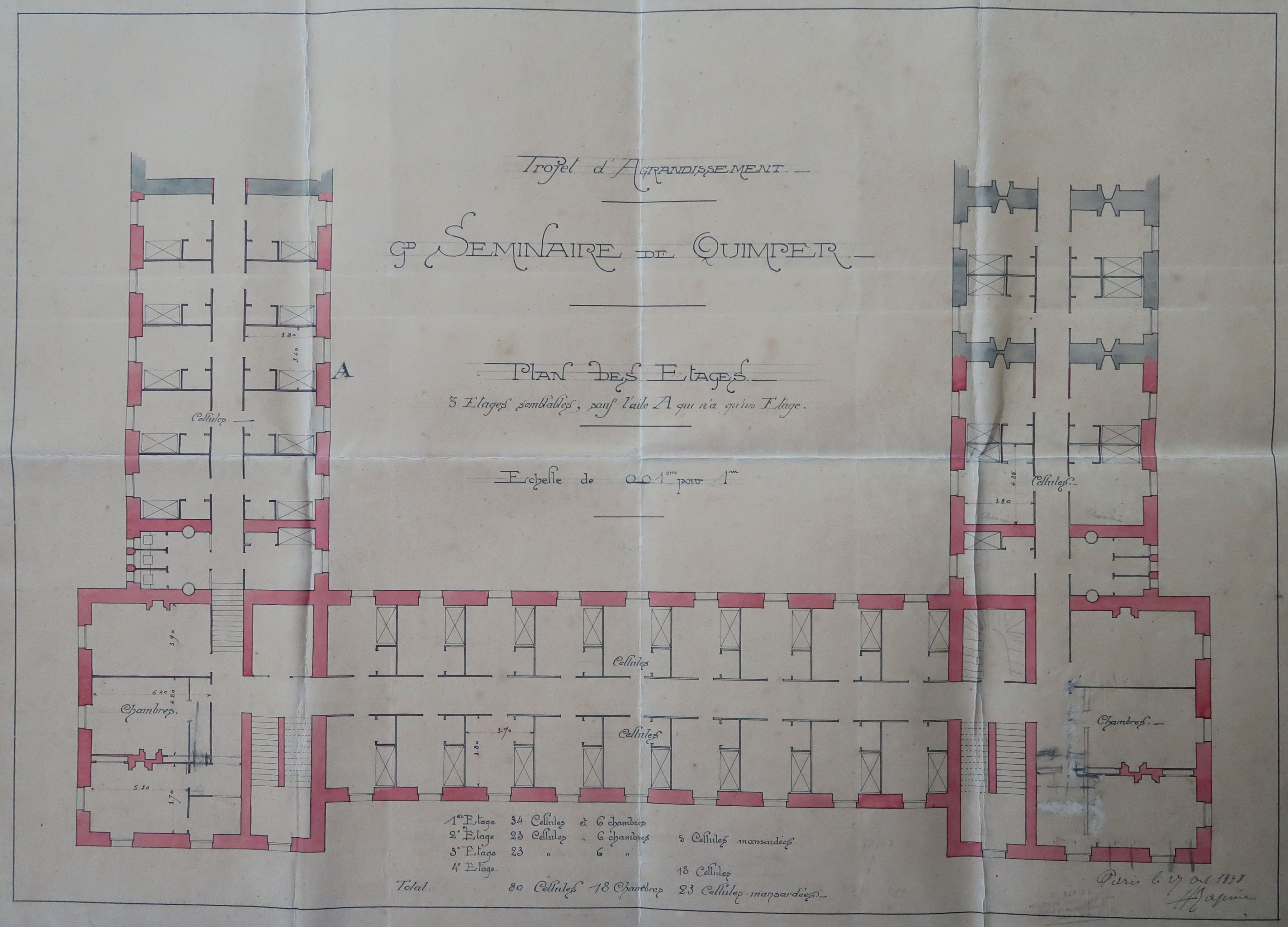 Grand Séminaire. Projet d'agrandissement. Plan des étages. Henri Rapine, architecte, 1898. Noter l'ajout de 3 travées, et donc, la reconstruction de cette aile, au sud-ouest de l'emplacement de l'aile démolie.Immatriculation