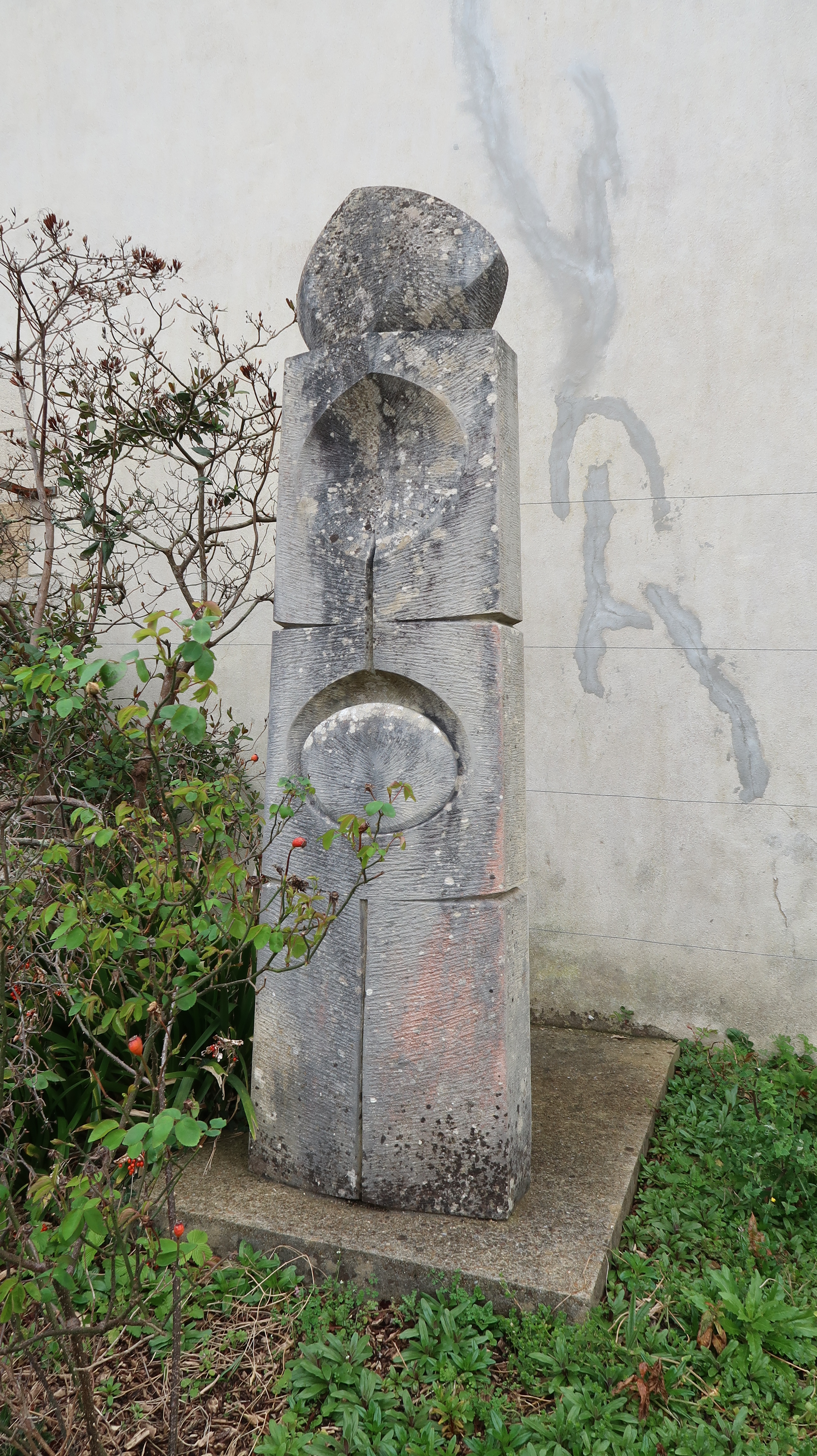 Pierre Vélon, sculpture en pierre de Larrys, 1975, adossée au mur de la chapelle (décoration au titre du 1% artistique).Immatriculation