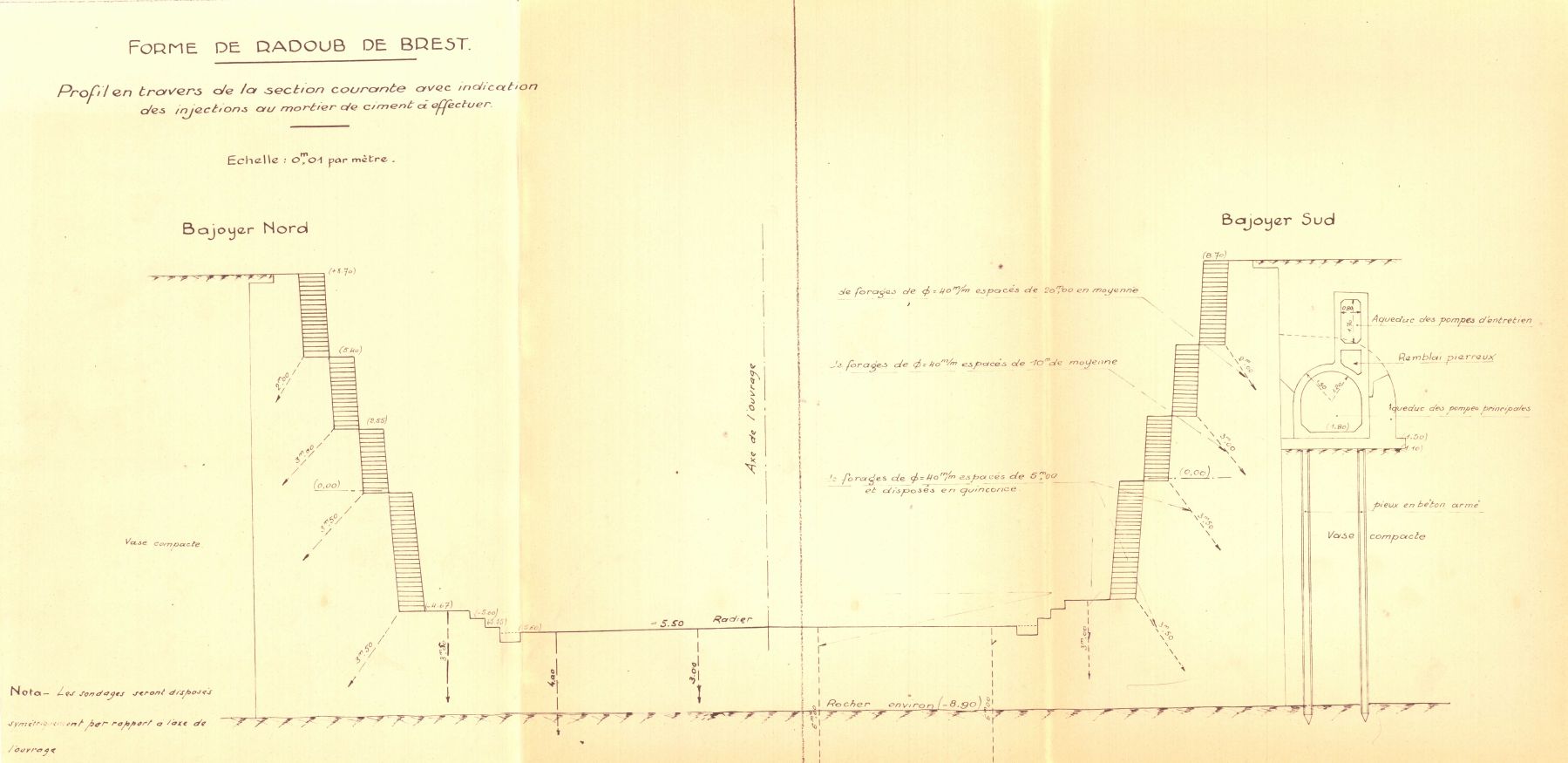 Forme de radoub de Brest : profil en travers de la section courante avec indications des injections au mortier de ciment à effectuer (1948)Immatriculation