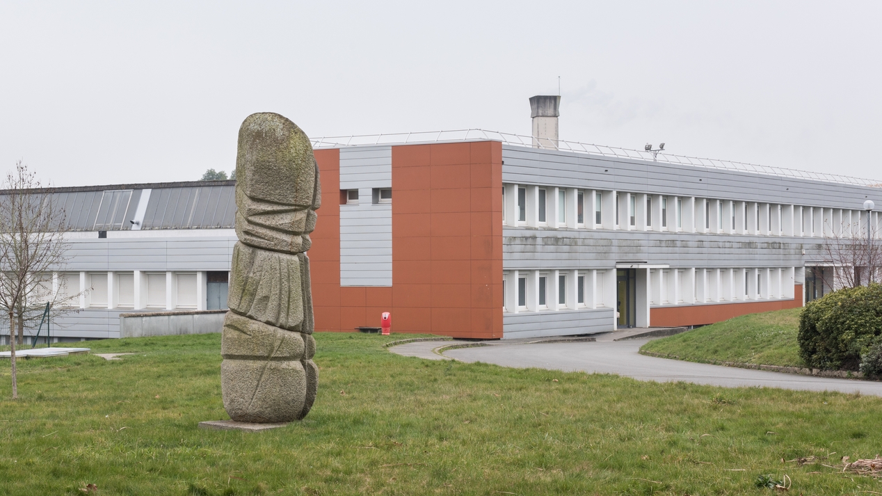 Sculpture d'Helier Pellerin et Lise Mazo pour le lycée professionnel Jean Guéhenno. A l'arrière plan, bâtiment G, ateliers.Immatriculation