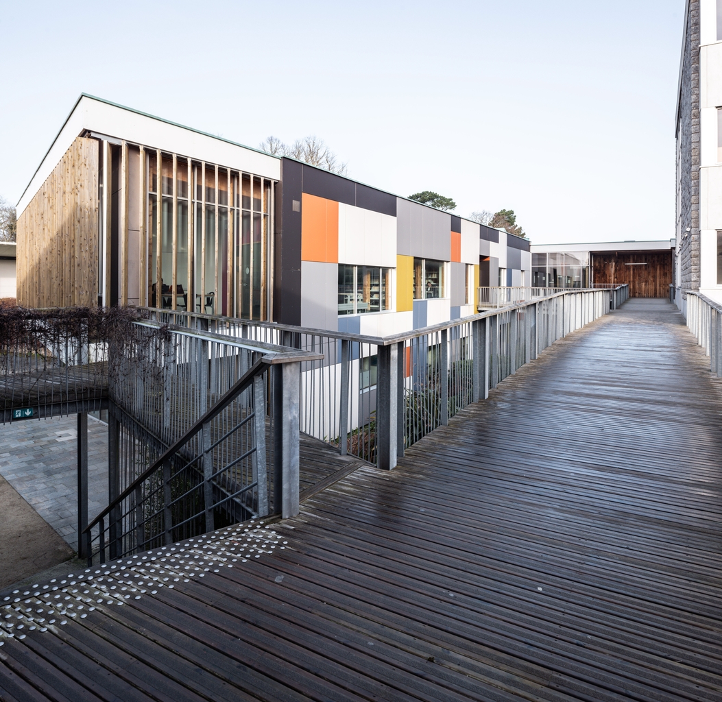 Le CDI, façade est (Thierry Soquet, architecte, 2012). A l'arrière plan, l'administration, à droite, façade de l'externat.Immatriculation