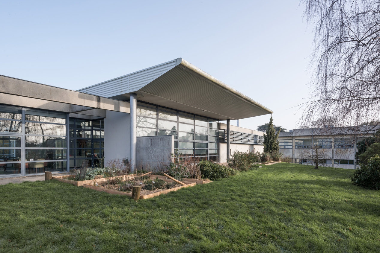 Restaurant pédagogique et salle polyvalente, façade sud (Pierre Pacault, architecte, 1993). Noter l'imposant auvent faisant fonction de brise-soleil.Immatriculation