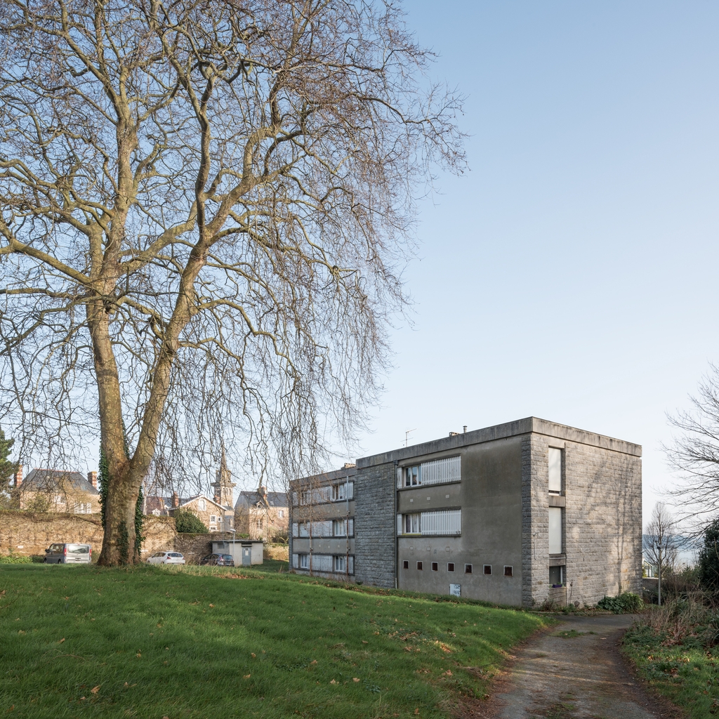 Façade ouest et pignon sud du bâtiment des logements de fonction. Patrice Simon, architecte, 1973.Immatriculation