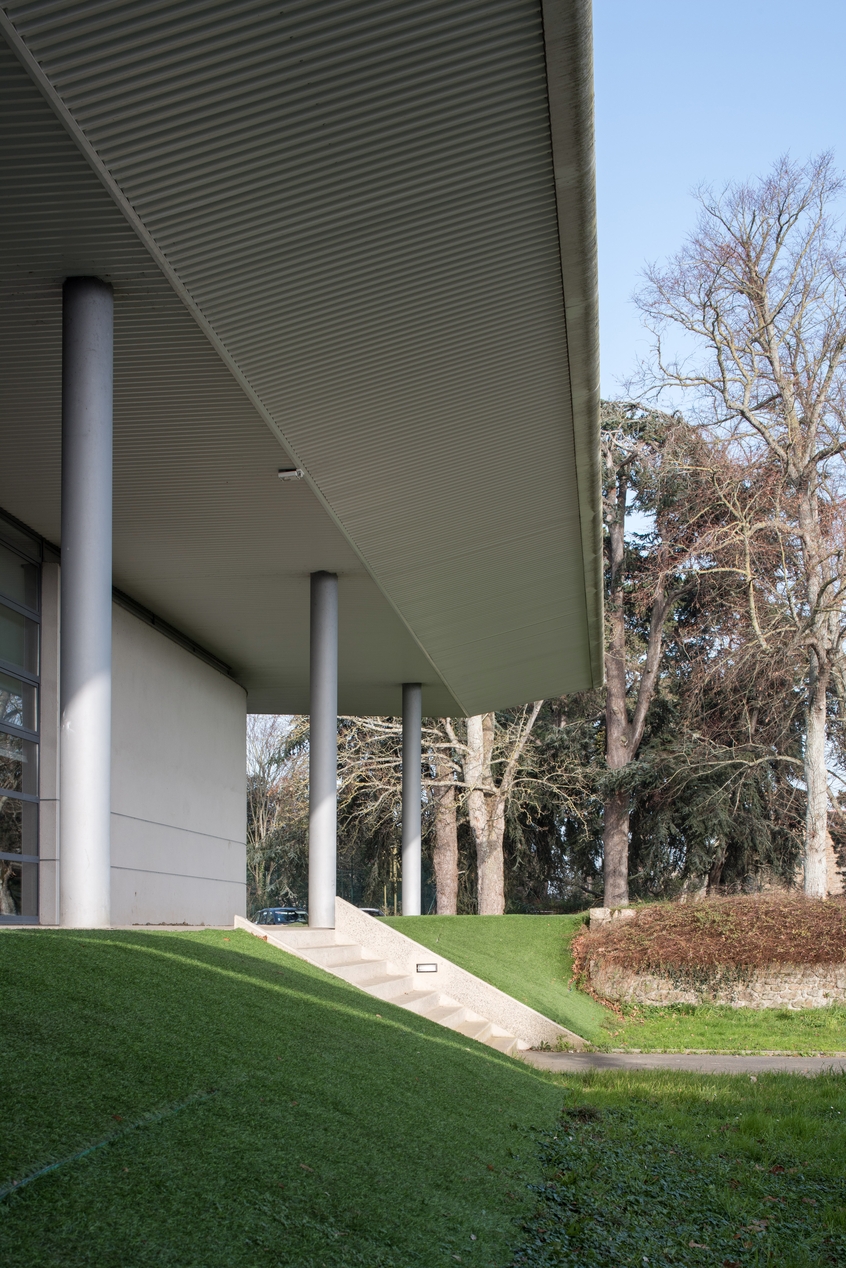 Façade est de la salle polyvalente (Pierre Pacault, architecte, 1993).Immatriculation