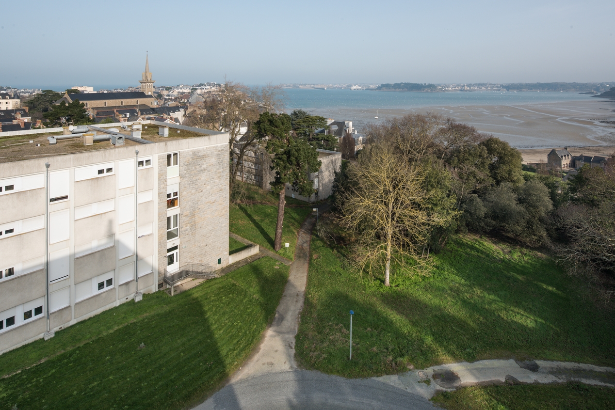 Contexte paysager : vue sur le parc et la mer, depuis les toits de l'internat de filles. Au premier-plan, l'internat de garçons. Sous la frondaison, le bâtiment des logements de fonction.Immatriculation